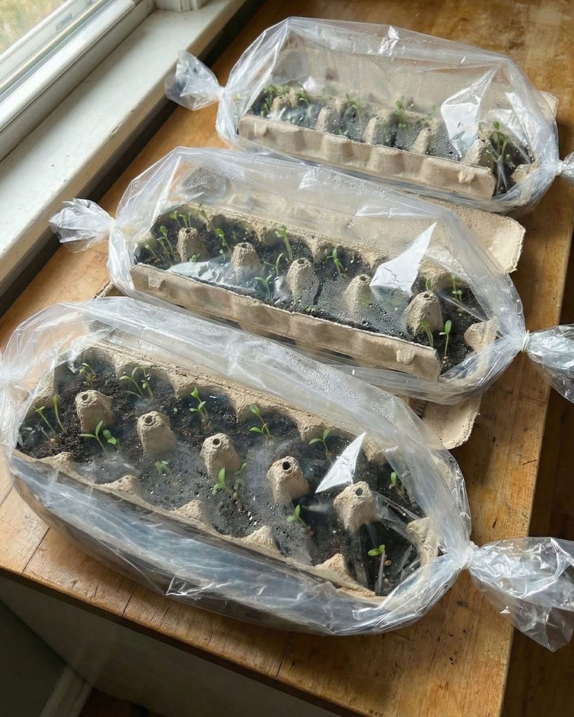 Starting seeds this way costs almost nothing. You’re already buying eggs and yogurt, so save those containers instead of throwing them away.