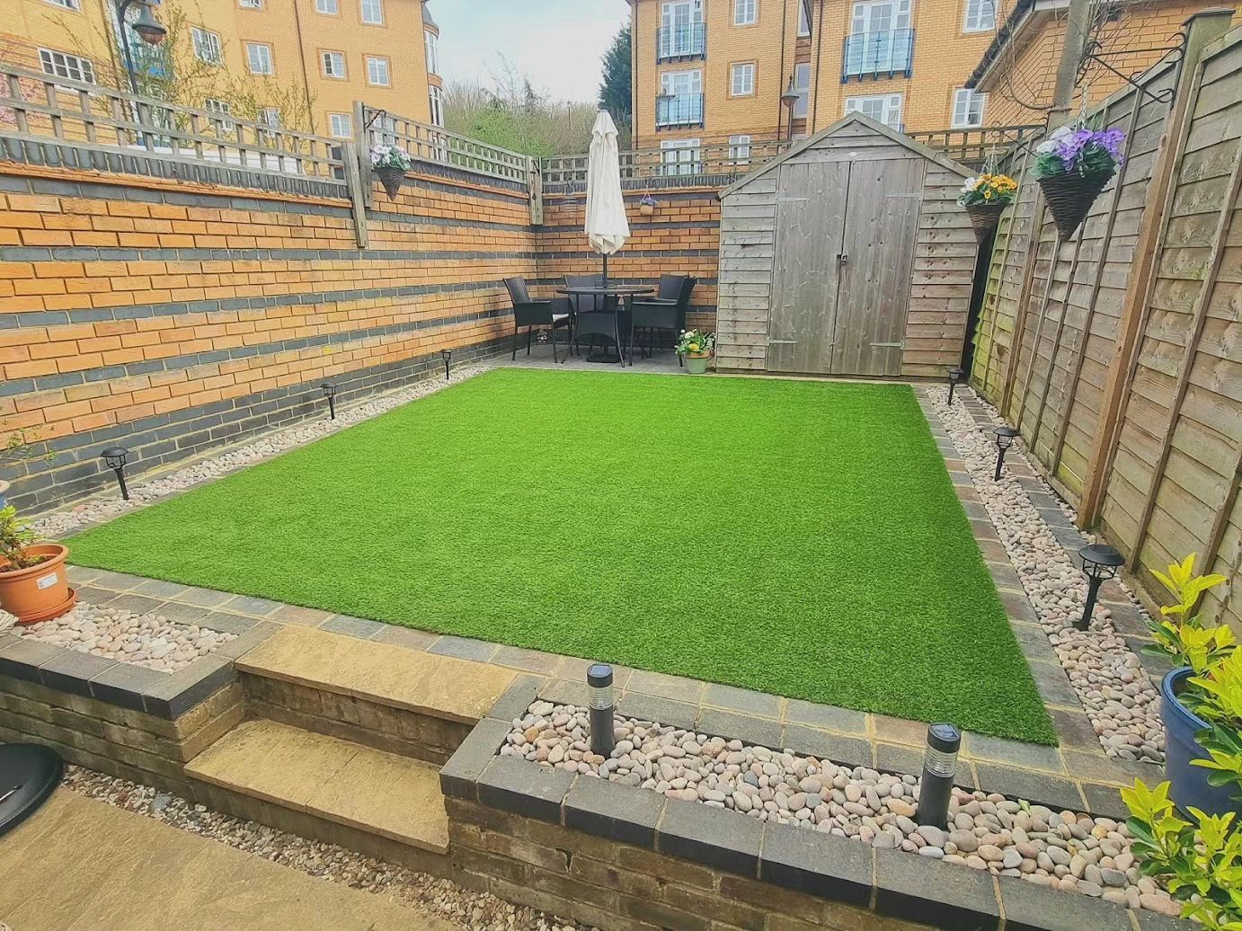 A weathered wooden shed anchors the back corner, offering practical storage space. Pastel brick walls frame the yard, providing a warm, enclosed feel that’s inviting yet private. With hanging flower baskets adding pops of color, it feels fresh but not overdone.
