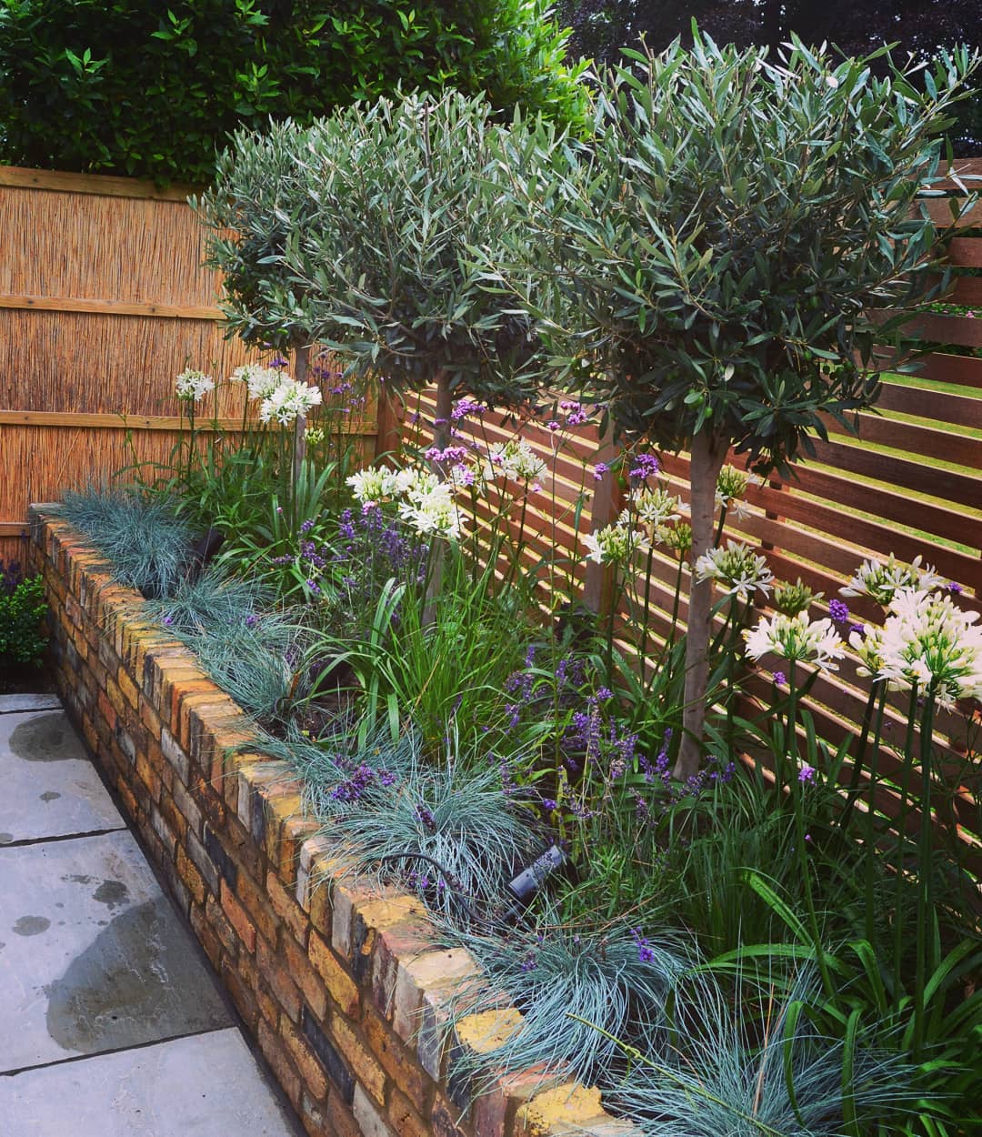 Tall, lush greenery steals the show here. Olive trees are smartly trimmed into neat spheres, adding structure and height. Delicate white and purple flowers pop vividly against the cool tones of the leaves and the rich brown fence. The arrangement feels fresh and intentional, drawing the eye naturally from one point to the next.
