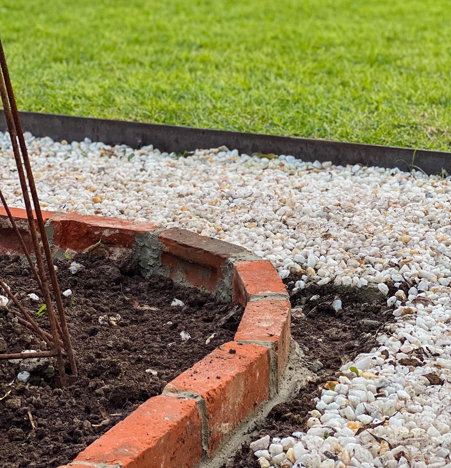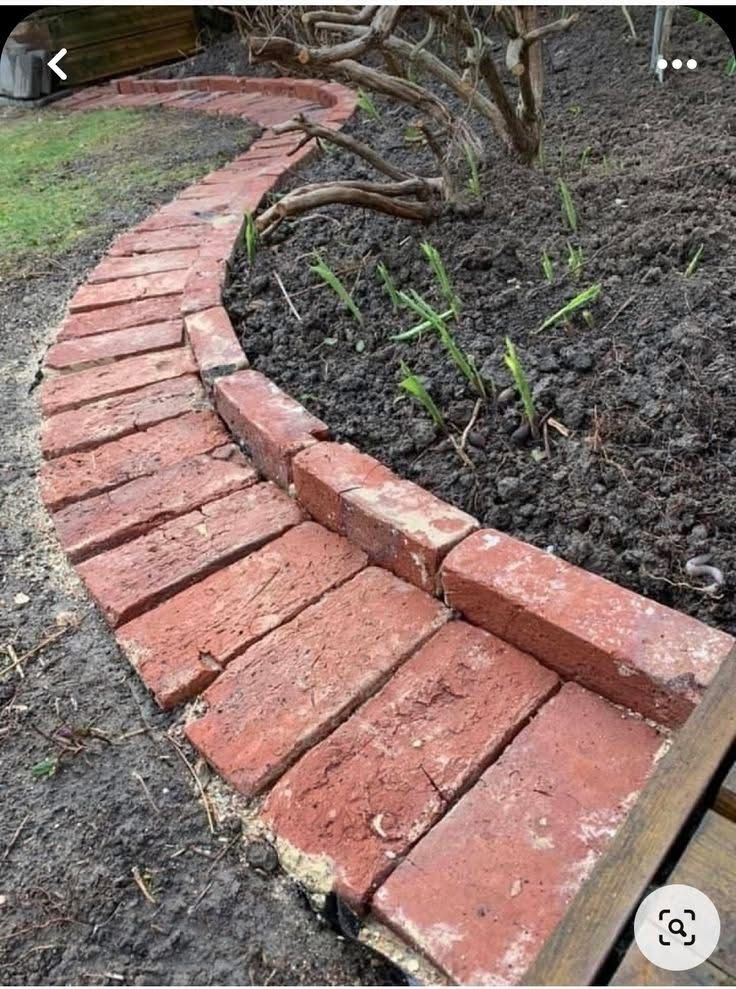 The warm red tones of the bricks immediately catch the eye. Laid neatly, they form a sinuous border along the garden bed. The orderly arrangement contrasts with the rich, loose soil on the right, hinting at freshly planted greenery.