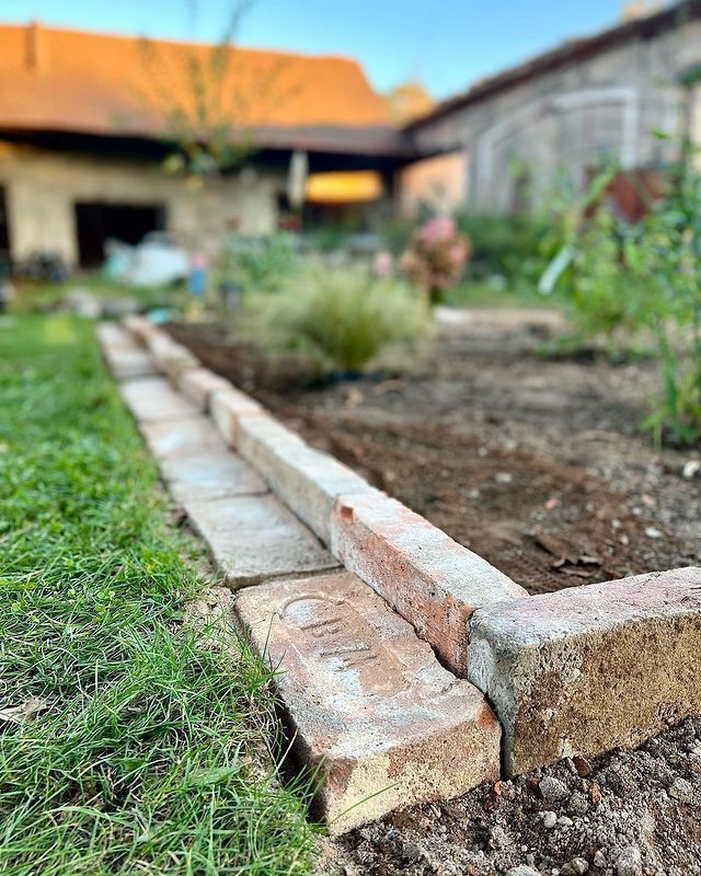 A line of uneven bricks artfully edges a garden bed, creating a rustic border with a charming, handmade feel. The earthy tones of the bricks contrast with the rich brown soil and freshly cut green grass. Each brick tells a story, with some edges chipped or worn, giving it a vintage vibe.