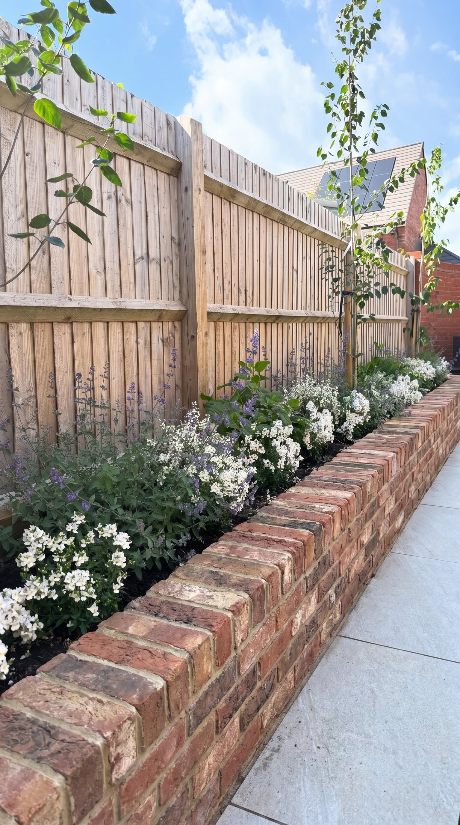 Brickwork forms a low wall, running parallel to the fence. It gives a nice earthy contrast to the lush greenery. This setup feels like it would suit any backyard space.