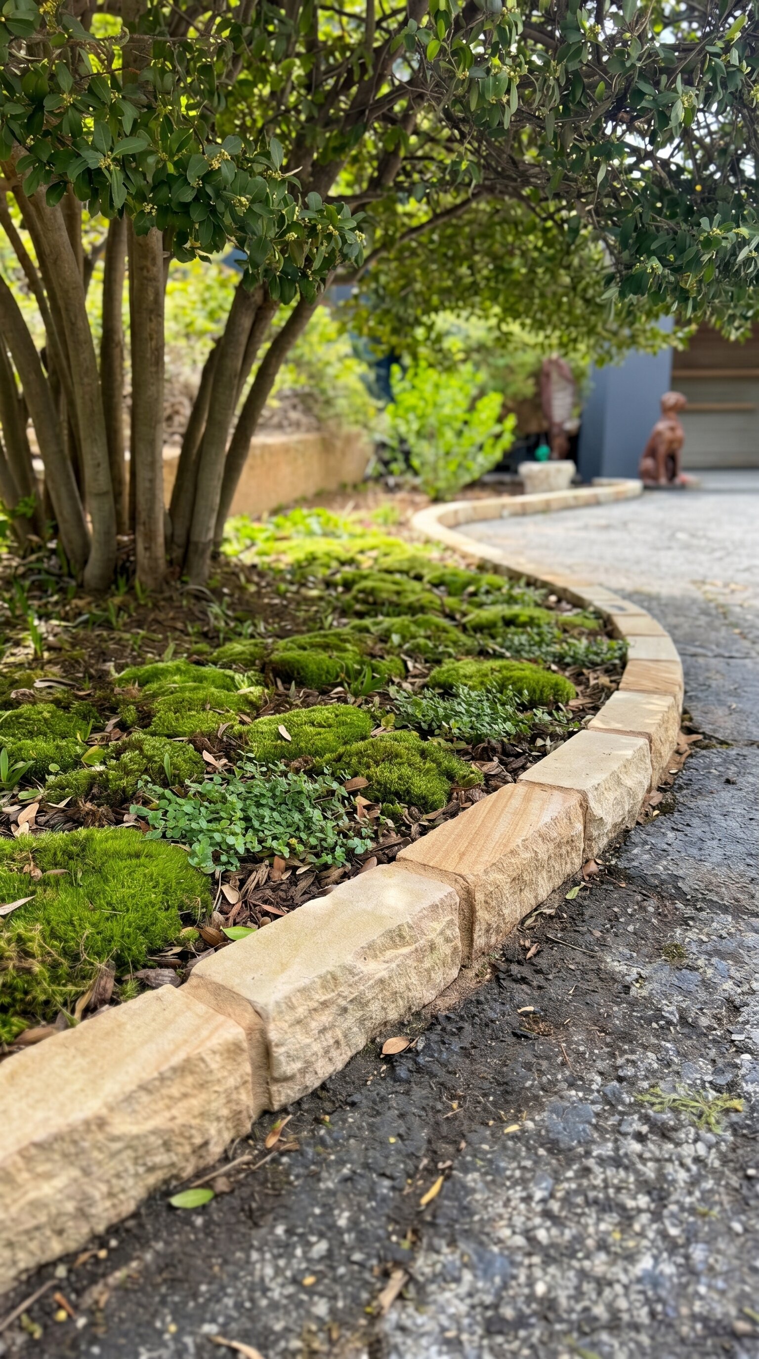 The stone border provides a clean and defined look. Each block fits snugly with the next, creating a subtle curve that leads your gaze down the walkway. It’s a simple but effective way to separate the greenery from the asphalt path, keeping things tidy and organised.