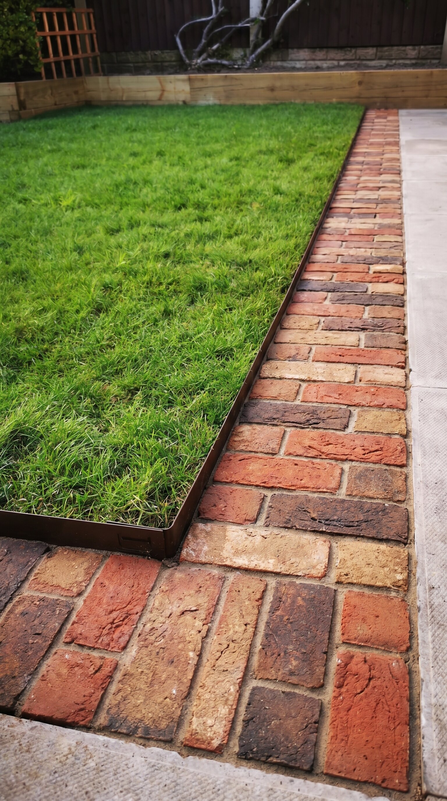 Bright green grass meets a carefully laid path of earthy red bricks. The contrast between the cool tones of the lawn and the warm hues of the bricks creates a pleasing visual balance. It’s a classic border design that gives the space a structured, yet inviting feel.