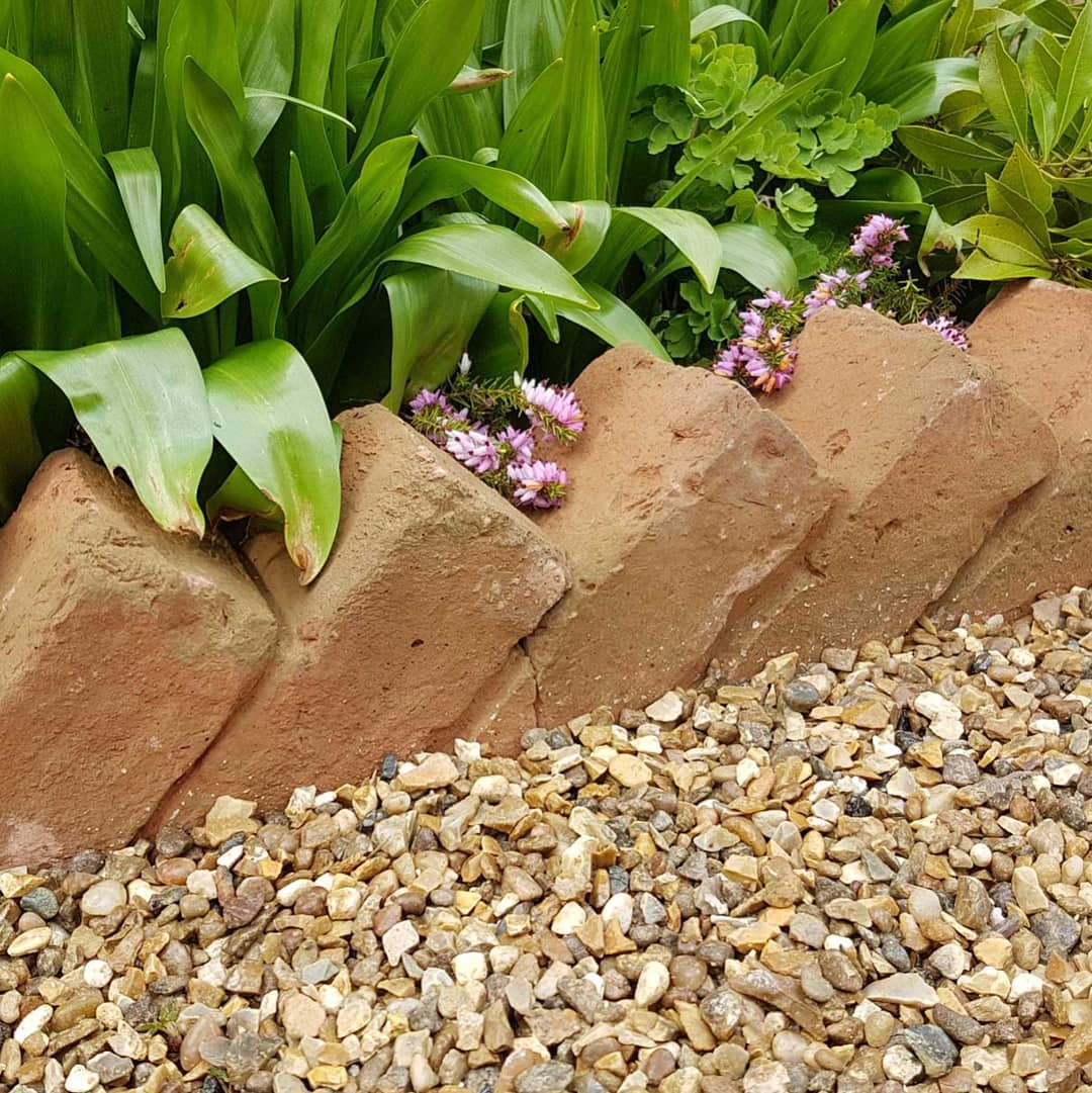 Rough, earthy bricks are set on a diagonal, forming a neat border for a small garden bed. The bricks lean into each other, creating a sense of stability and natural charm. This simple arrangement is ideal for keeping garden beds tidy and well-defined. It adds a rustic touch that feels both organised and inviting.