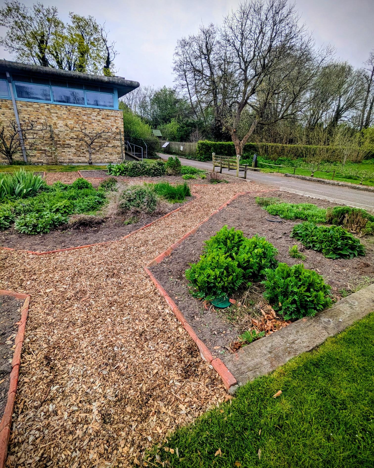 Wood chips form a welcoming path through a neatly organised garden. The path curves gently between raised beds bordered with red bricks. Lush greenery pushes up from the soil, giving the space a vibrant, alive feel. It’s all about simplicity and easy maintenance here.