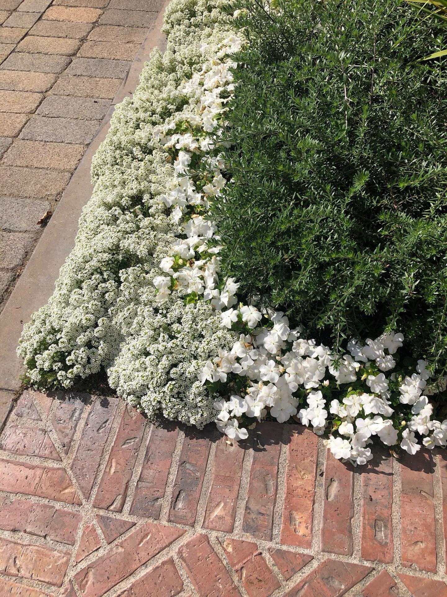 Little clusters of white flowers hug the ground tightly, creating a soft, textured blanket. They spill gently onto a mix of red and brown brickwork, adding a touch of nature to the structured setting. Beside them, a dense patch of green foliage offers a contrasting backdrop.