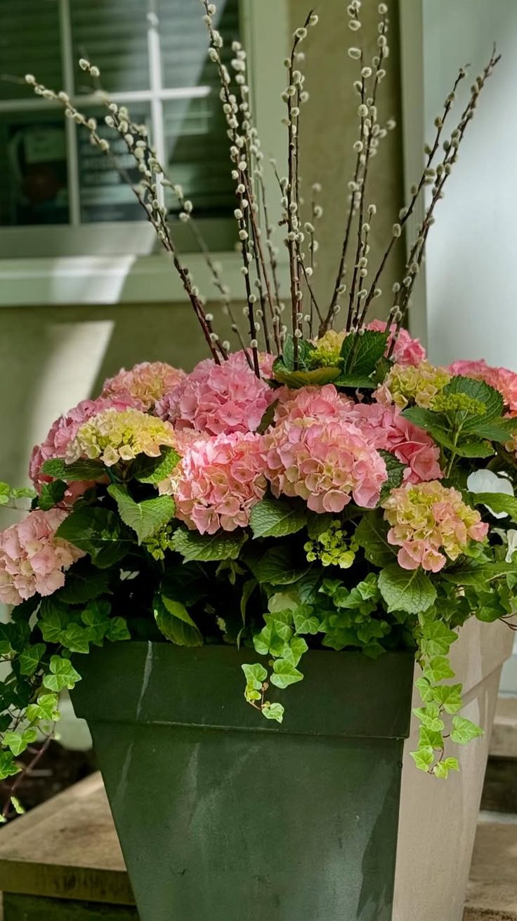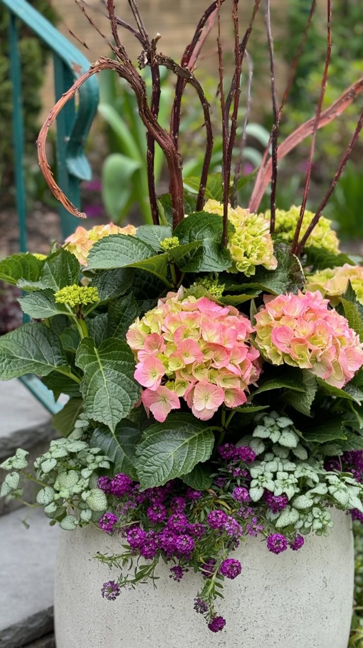 Bright hydrangeas in shades of pink and green immediately catch the eye, standing bold against the deep green foliage. Sticks add a rustic touch, giving height and a bit of wildness to the arrangement. It’s the kind of setup that brings a burst of color to a spot on the patio.