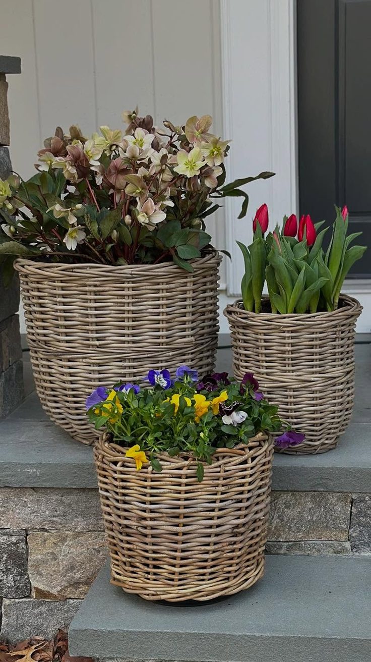 The smallest planter is filled with cheerful pansies in yellow, purple, and white, adding a pop of color. The natural wicker texture gives a cozy, rustic appearance that complements the stone background. This setup creates a welcoming vibe, perfect for a front porch.