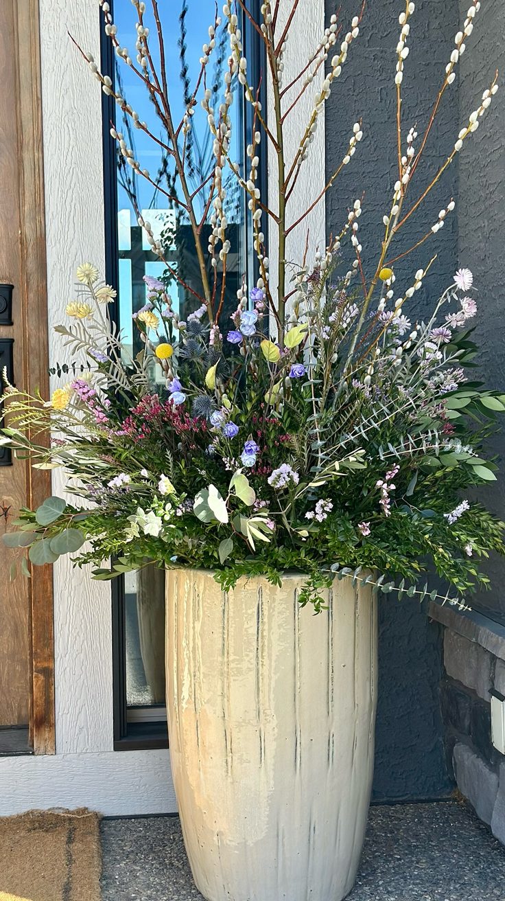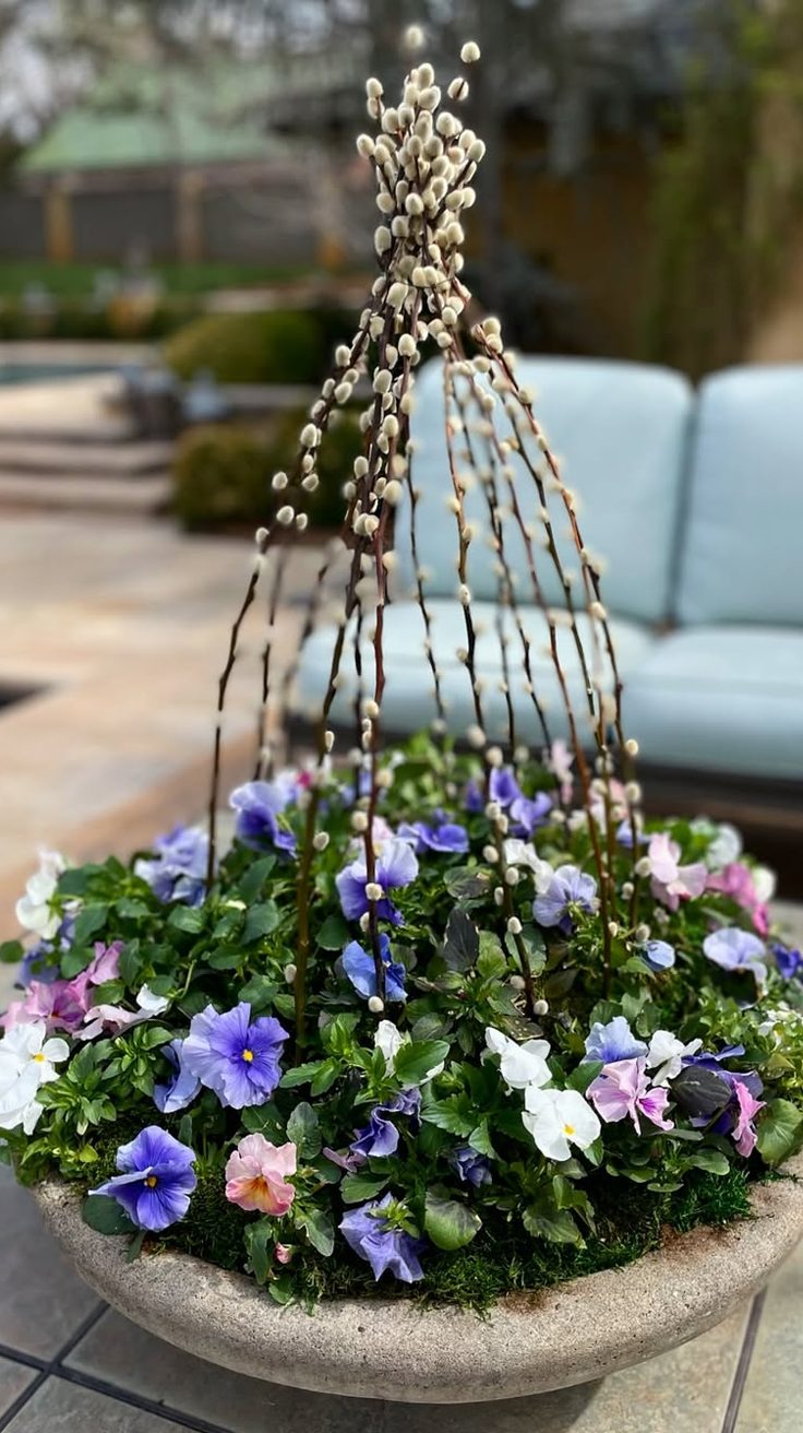 Pussy willow branches stretch upward, catching your eye immediately. Their soft, furry buds add an unexpected texture. Mixed among them are delicate blooms in soft purples, yellows, and whites, popping against the greenery below.