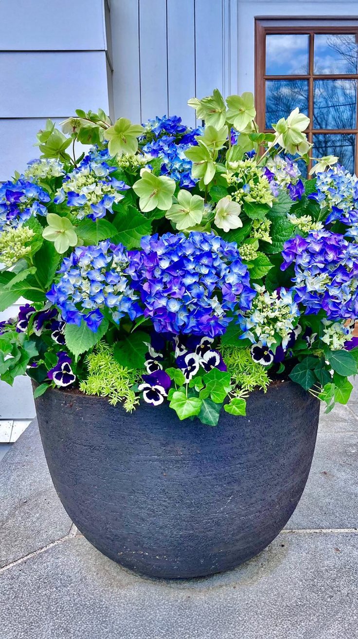 Deep blue and white hydrangeas steal the spotlight, offering a pop of color that’s hard to miss. Among them, soft green flowers add a calming contrast, creating a refreshing balance. The pot is a simple dark gray, grounding the vibrant display above it.