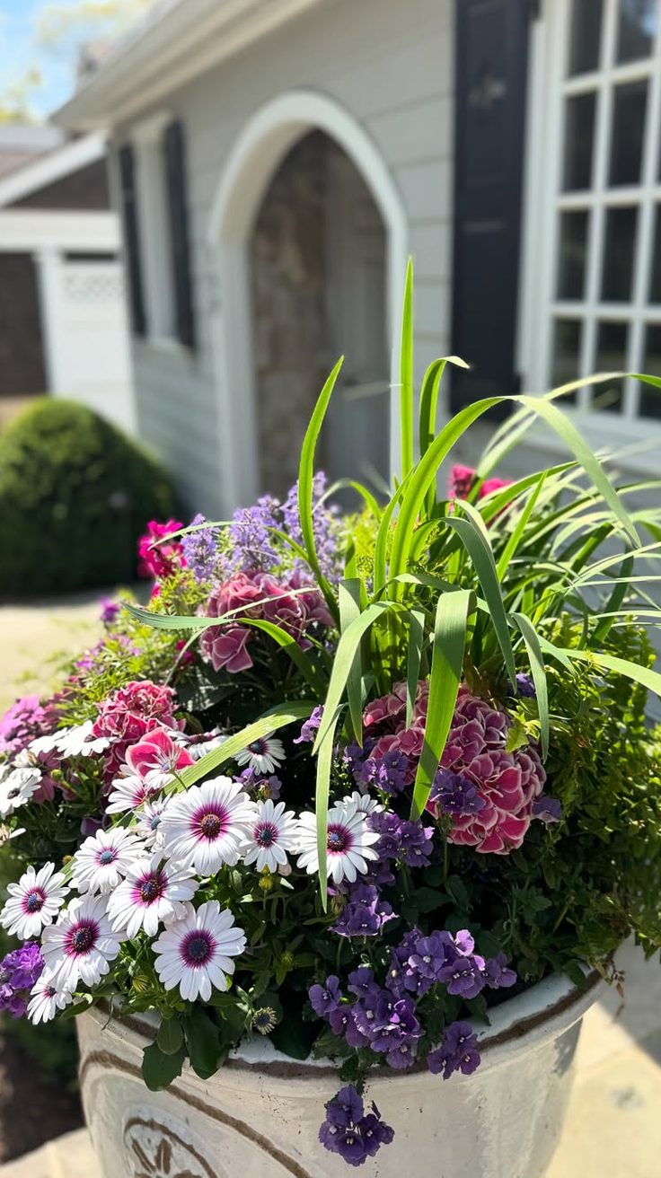 The container is sturdy and white, matching well with the house’s exterior. It all comes together to make a lovely first impression. The layered look of taller grasses rising above the flowers creates depth and interest, making it stand out.