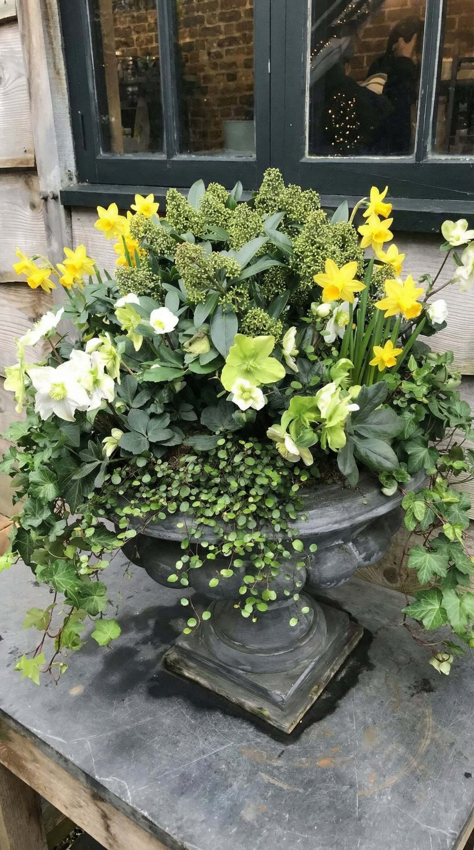 Yellow daffodils pop against the deep green foliage in a beautifully aged stone planter. White flowers peek through, adding brightness and contrast. The rich texture of the leaves complements the smooth surface of the pot, making the whole arrangement feel balanced and inviting.
