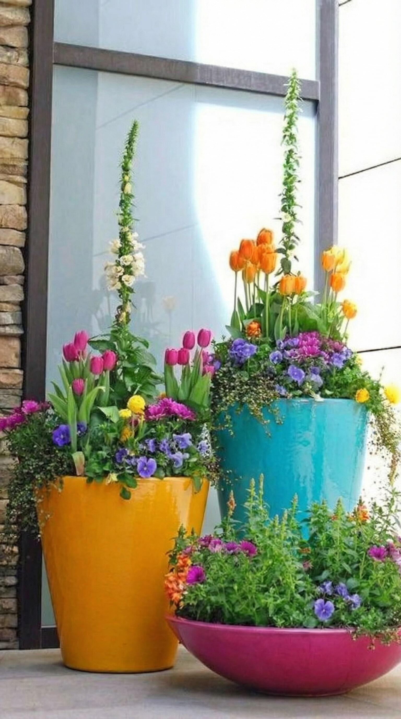 Vivid colors jump out at you with these pots. The tallest one, a vibrant yellow, holds a mix of pink tulips and cascading greenery. Beside it, an eye-popping teal pot is filled with orange tulips and deep purple flowers. The smallest, in magenta, sits low and wide, packed with lush green plants and bright blooms.