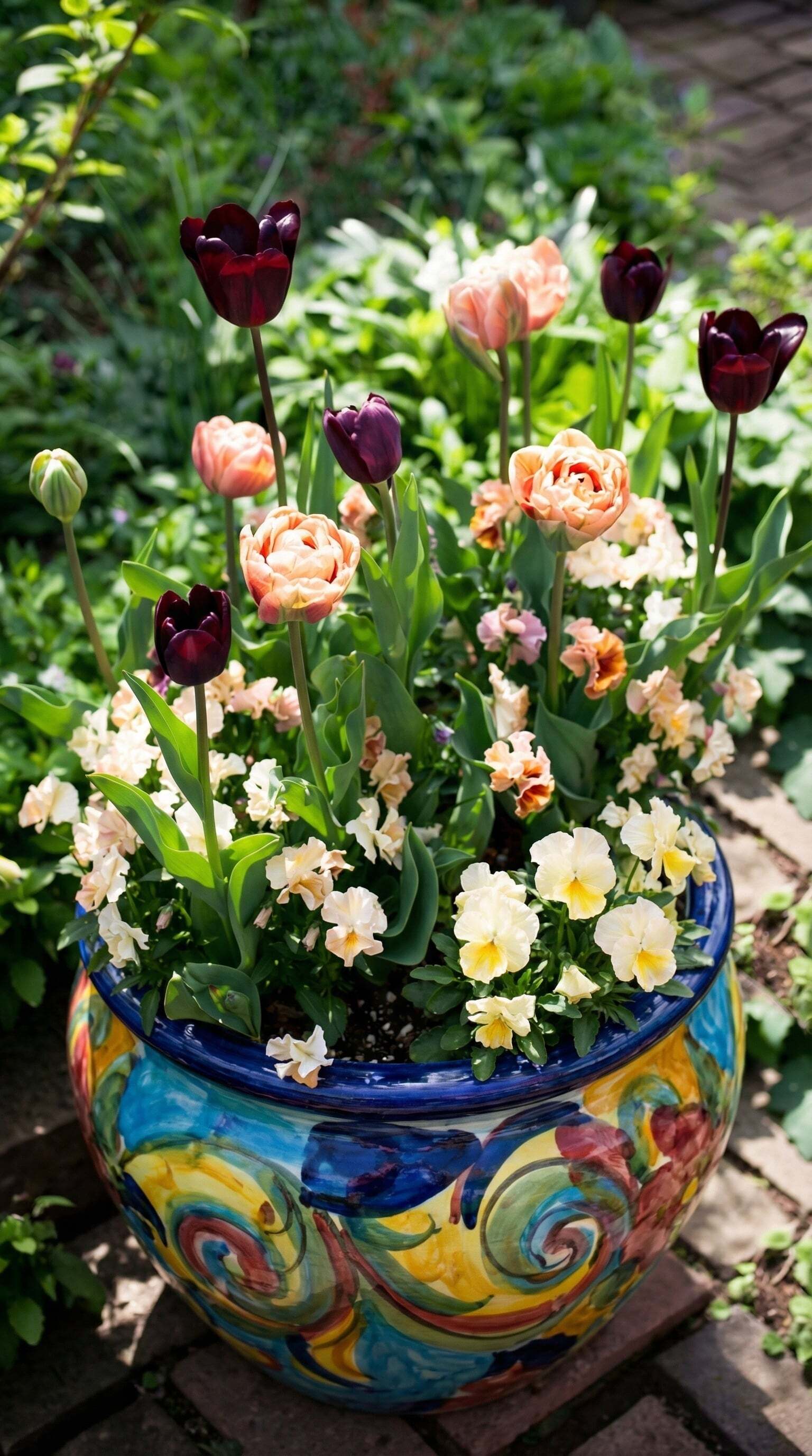 The pot itself is a vivid swirl of blues, yellows, and reds. This colorful base enhances the beauty above, almost like a piece of art. Its bold design complements the flowers, creating a cohesive, eye-catching display.