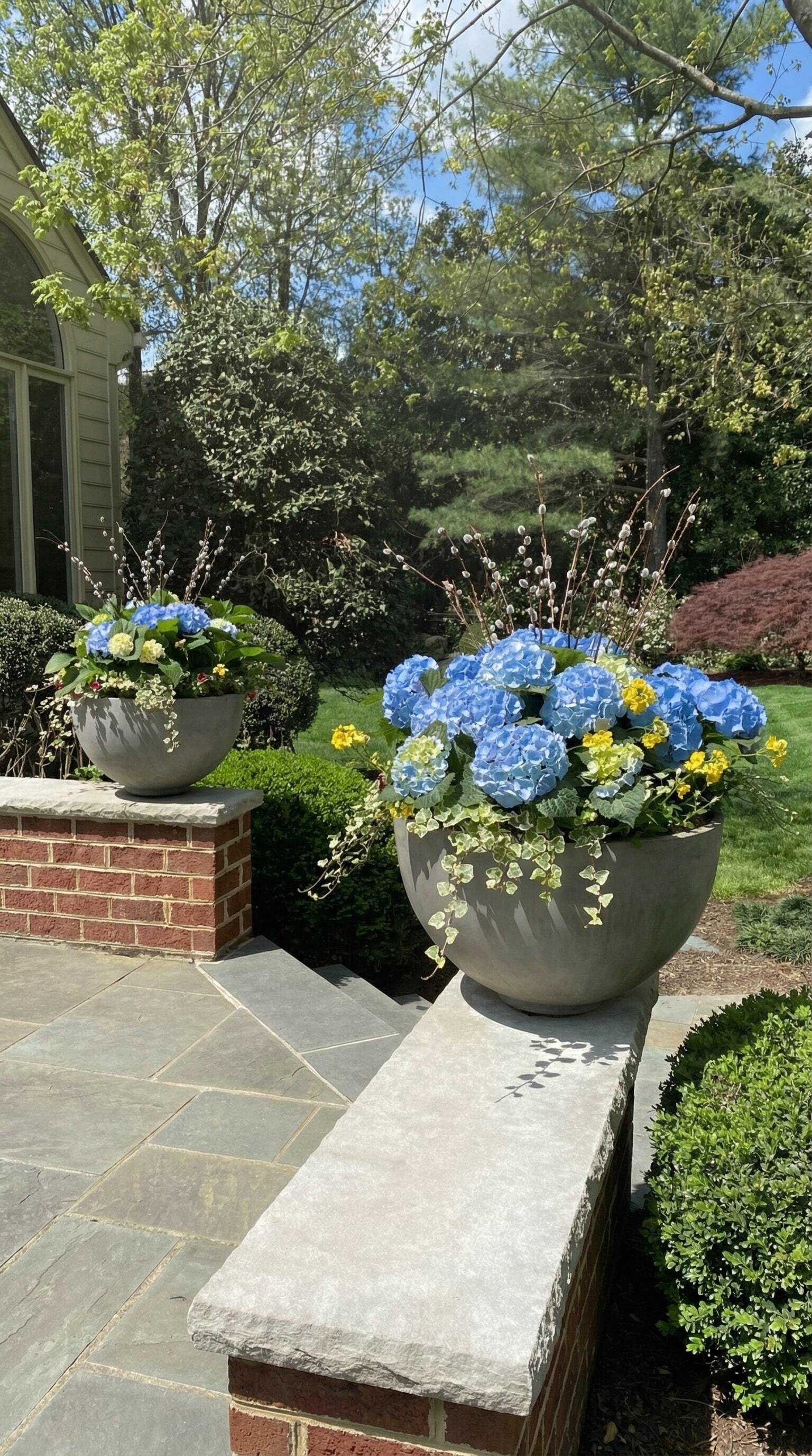 Bright blue hydrangeas steal the show in large, round planters. Their vibrant color contrasts against smaller yellow flowers and a trailing vine hanging over the edge. The arrangement sits on a stone wall, surrounded by a neat brick and tile patio, creating a tidy outdoor look.