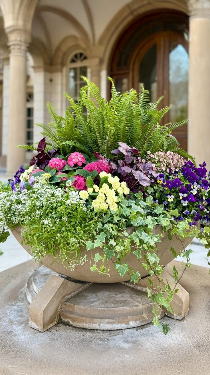 Surrounding the centerpiece, there’s a vibrant mix of pansies in a stone planter. The color palette includes purples, pinks, and whites, offering a fresh and cheerful vibe. This setup is practical for anyone looking to add a splash of color and life to their patio or garden.