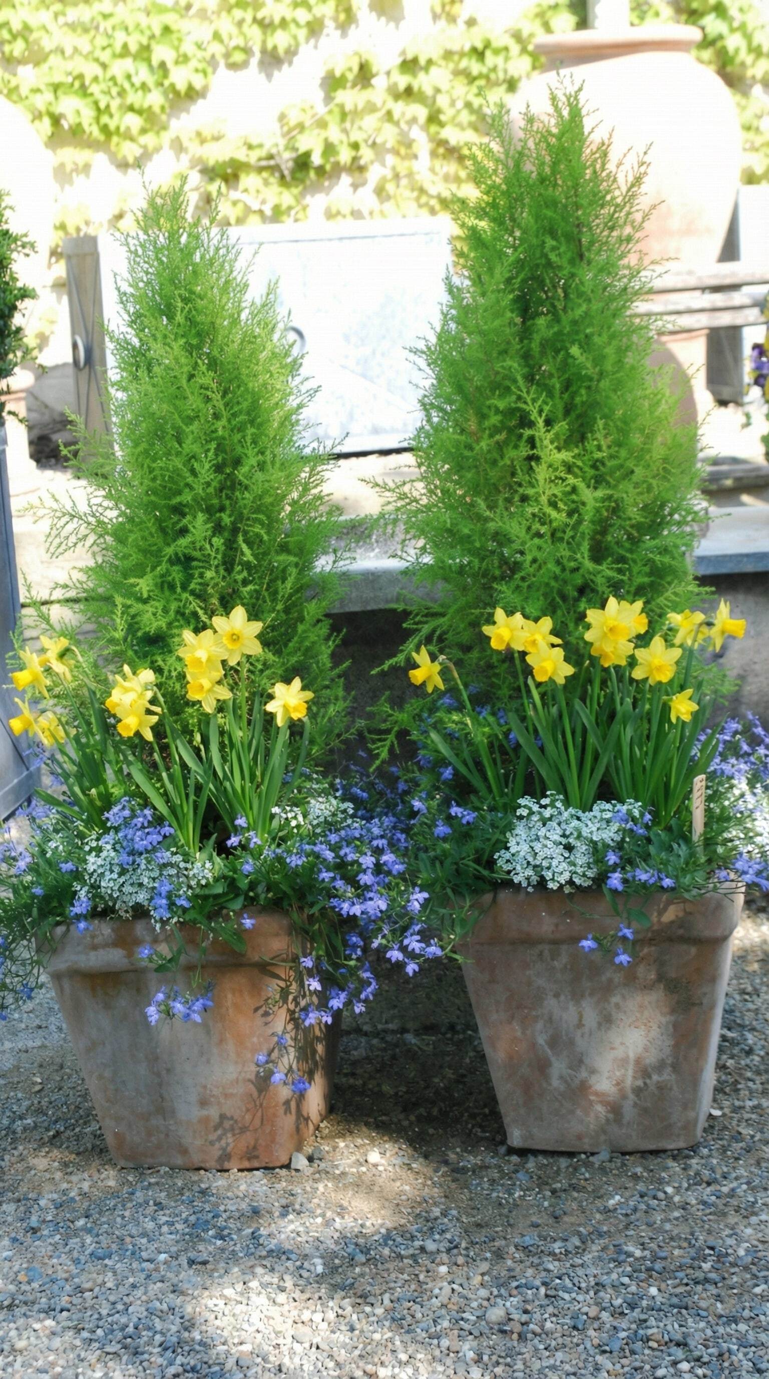 Set against a clean white building, these planters feel modern yet inviting. The height of the evergreens adds a sense of structure and elegance. They’d suit any urban space looking for a touch of nature.