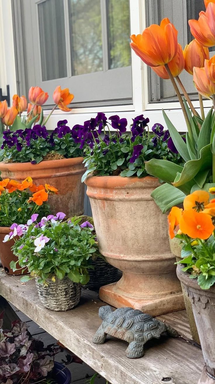 Pansies bring a mix of purple and yellow, planted in rustic terracotta and textured pots. This blend of colors and materials creates a cozy, welcoming vibe.