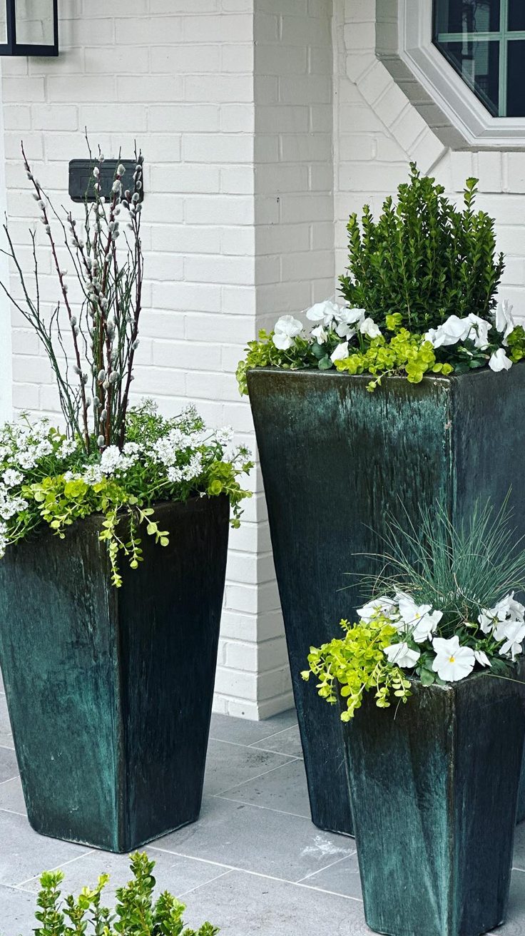 The dark green pots instantly catch your eye against the crisp white brick background. Each planter has a different height, creating a tiered effect that draws your focus upward. The plants are a mix of white flowers and lush greenery, adding a fresh and natural vibe. This combination of colors and textures makes the display visually appealing without being overwhelming.