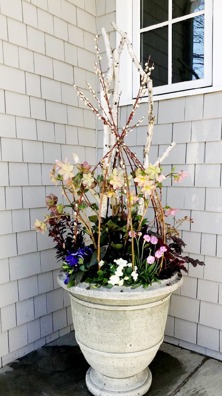 Tall birch branches stand elegantly in the center of a classic stone planter. They’re surrounded by delicate flowers, with soft pinks and whites making an appearance. Bright blue blooms add a pop of color, creating a refreshing look against the neutral gray background.