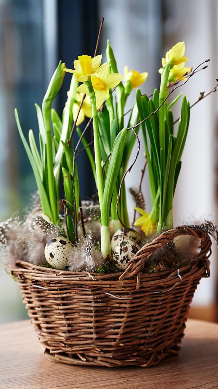 Bright yellow daffodils rise above the wicker basket, their fresh green stems reaching upwards. The blooms add a cheerful splash of color against the soft, natural backdrop. Delicate twigs and feathers weave through the setup, adding texture and depth.