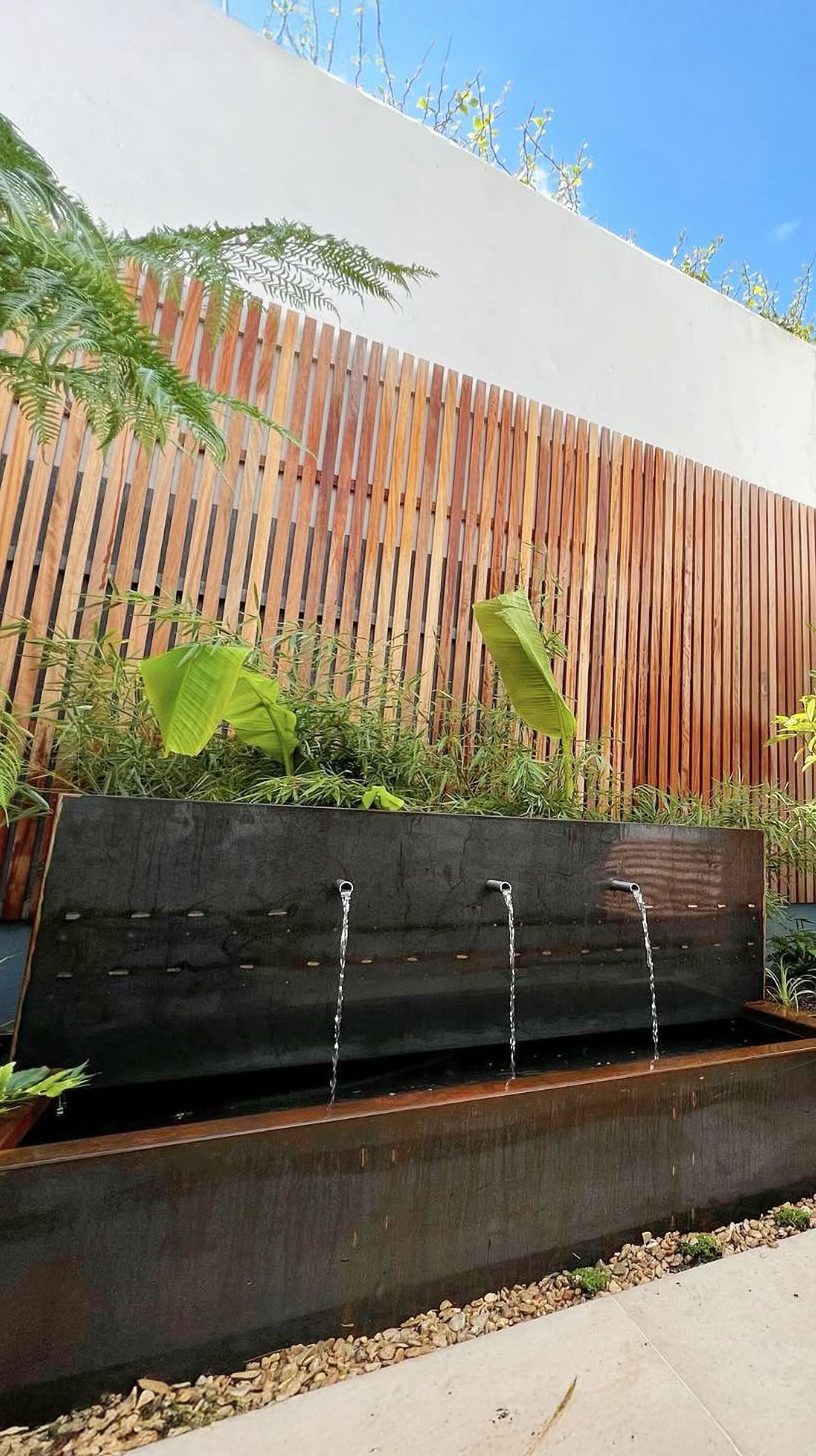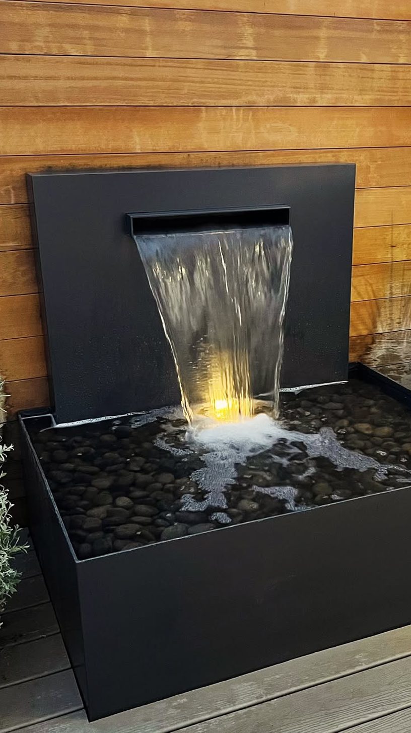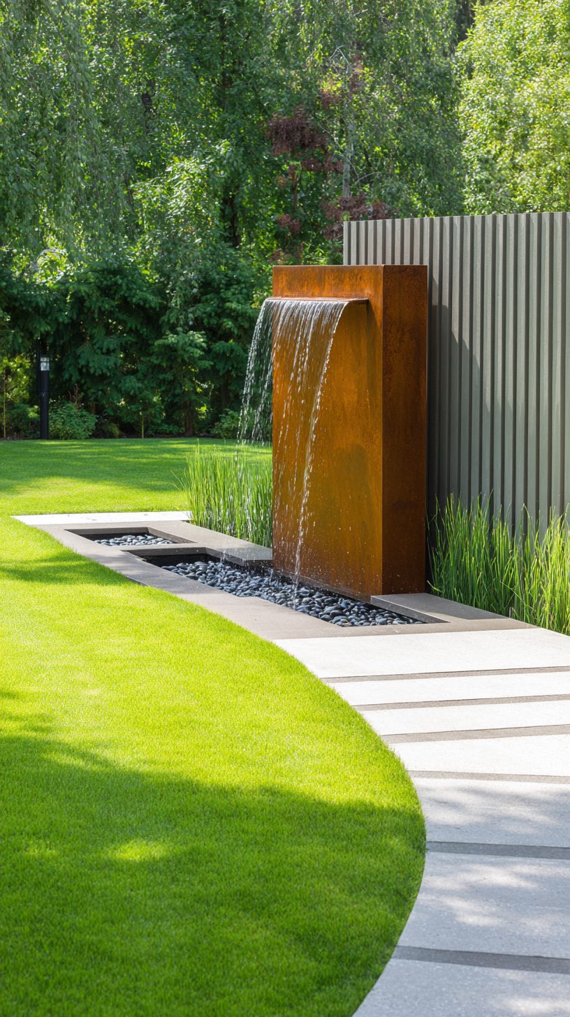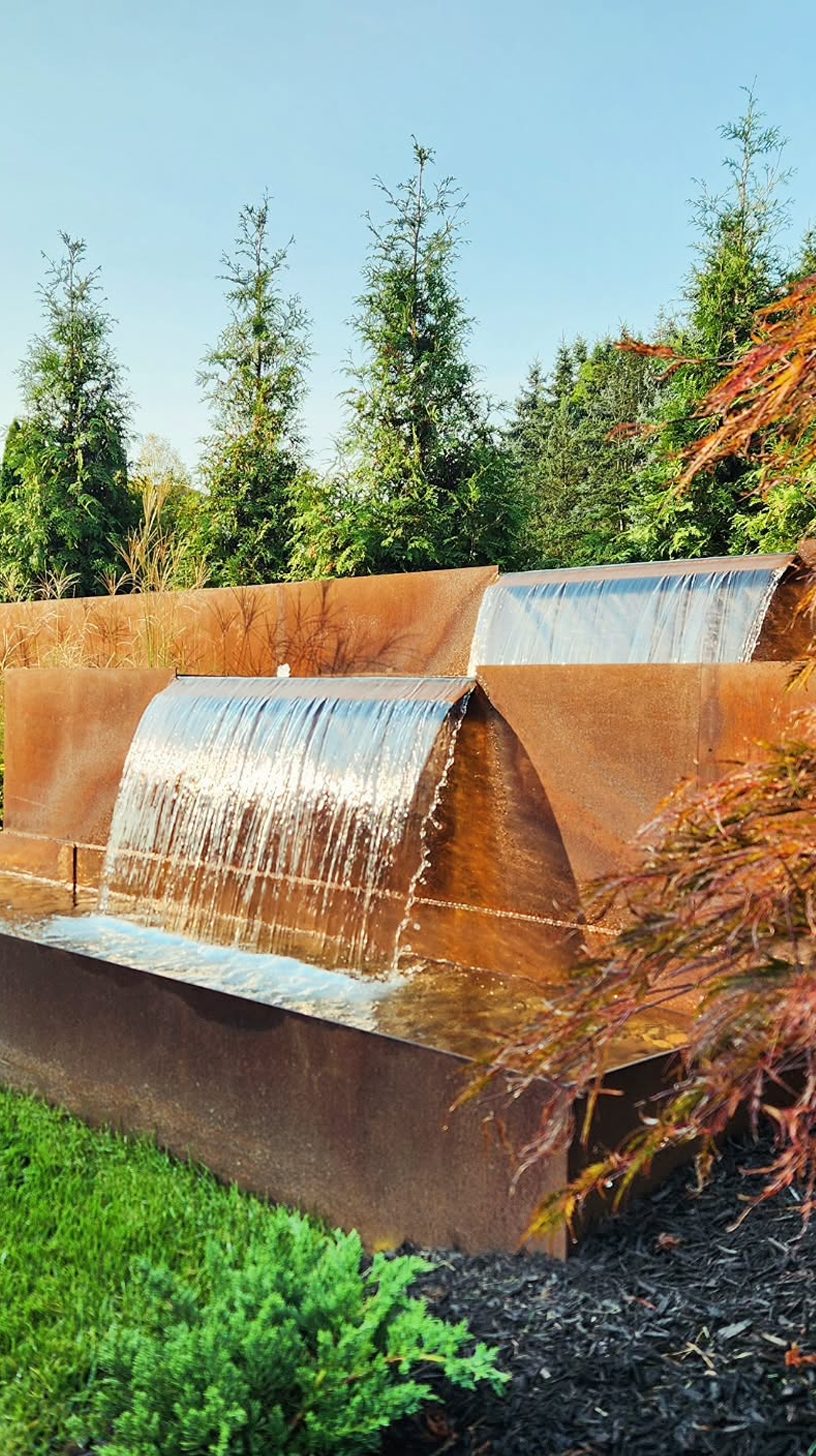 Cascading water flows over a rust-colored metal structure, creating a serene yet industrial vibe. The rust patina adds character, contrasting with the clear, smooth flow of the water. It’s a simple but effective design, bringing modern aesthetics into a natural setting.
