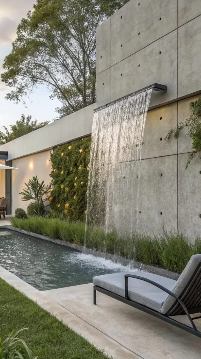 A wall of concrete sets the scene with a modern, industrial vibe. Water cascades gracefully over the edge, creating a smooth waterfall effect into the narrow pool below. Green plants embellish the area, adding a natural touch against the sleek background.