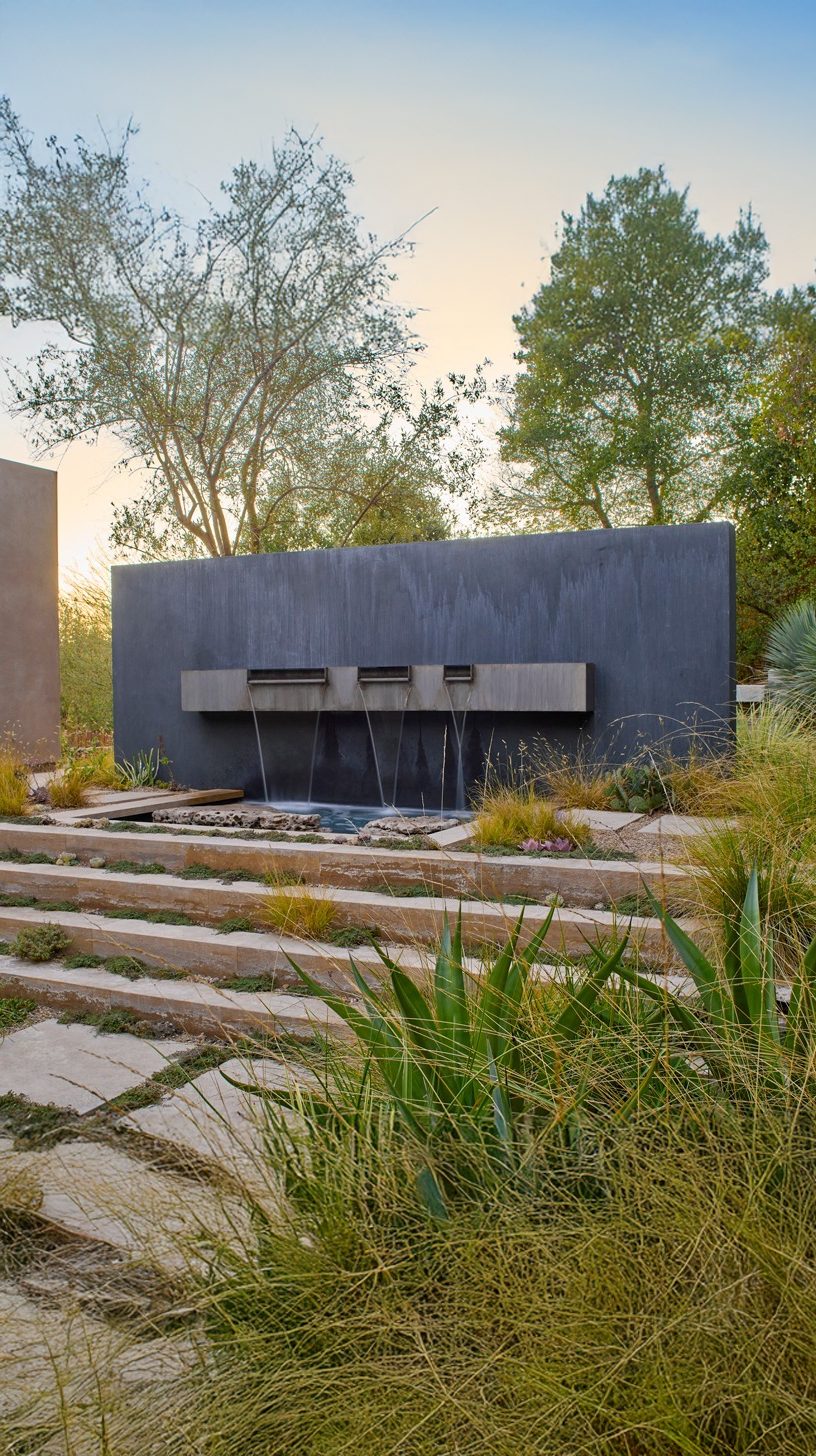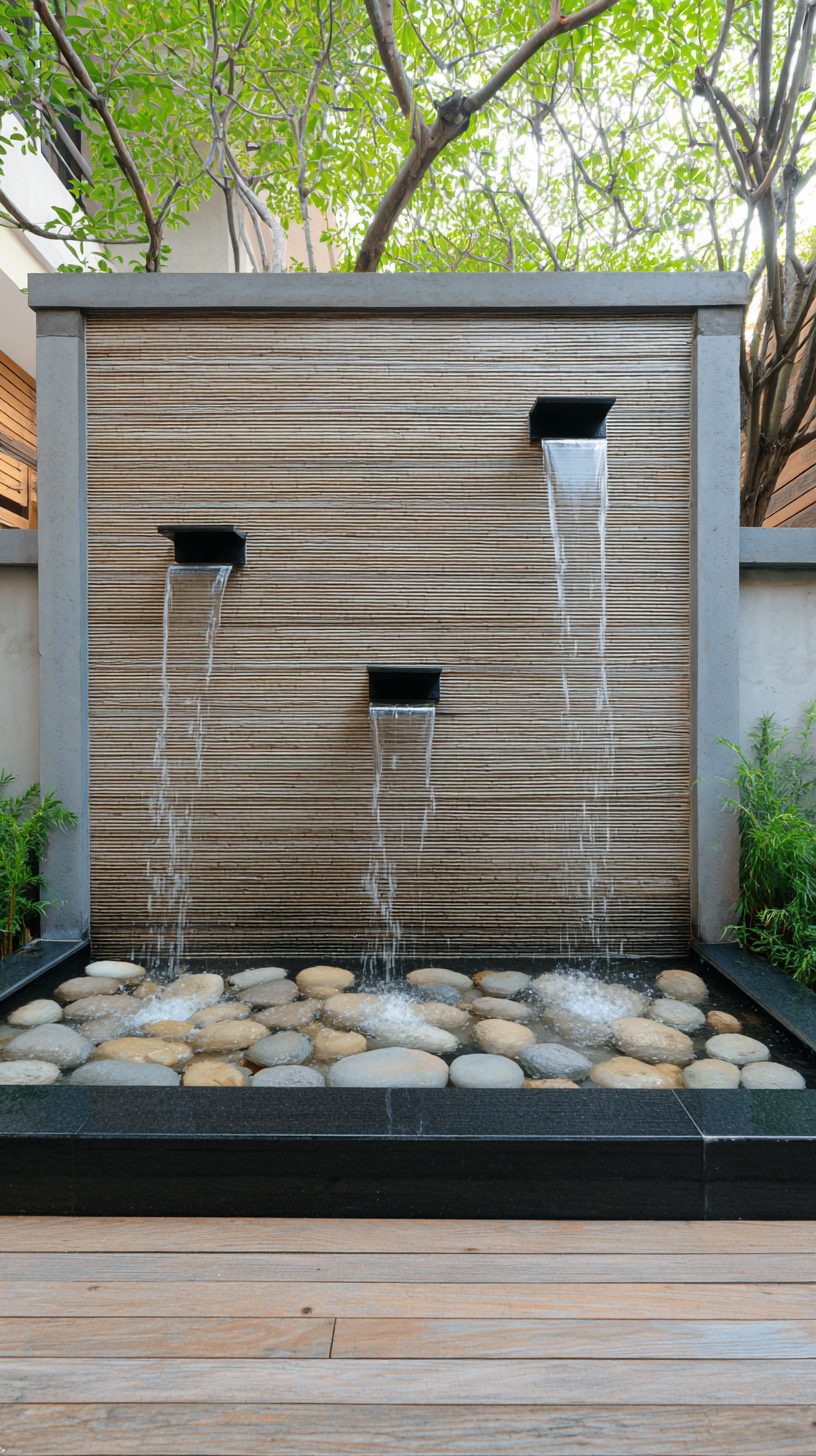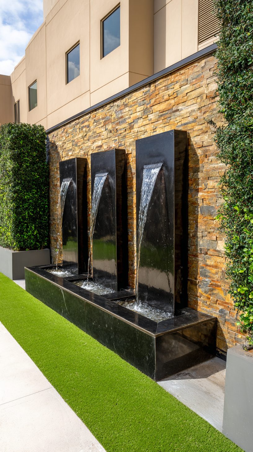 Three sleek metal spouts send slim streams of water into a peaceful basin. The dark wall backdrop makes the water pop, contrasting smoothly with the natural stone elements below. It feels modern but calm, adding a touch of sleek style to the landscape.