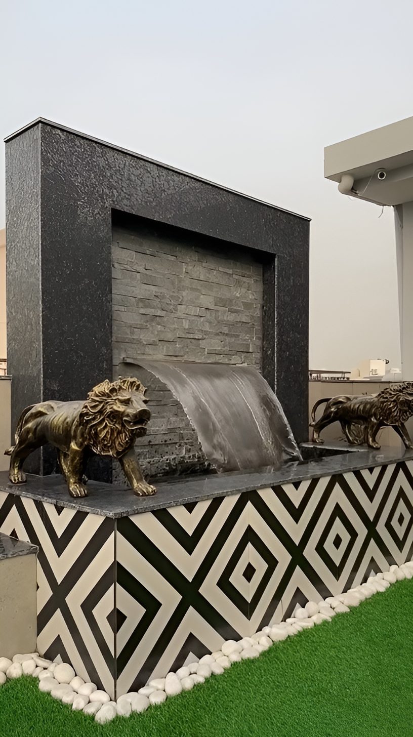 Dark stone defines this striking waterfall, with water cascading down in a graceful sheet. Flanked by two imposing bronze lion sculptures, it feels both regal and serene. The subtle texture of the stone backdrop adds a touch of sophistication.