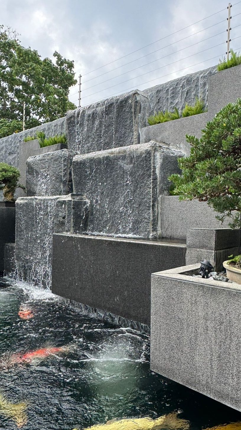 Massive stone blocks stack artfully, with water cascading down their surfaces. The minimalist design gives it a sleek, modern vibe that feels calming and intentional. Small planters with neat greenery add a splash of life amidst the stone.