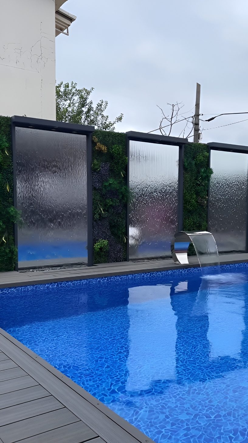 Rippling fountains flow down sleek glass panels, creating a soothing backdrop. Water cascades from a small metallic spout, splashing gently into the vibrant blue pool below. The setup feels modern and calming, perfect for relaxing outdoors.