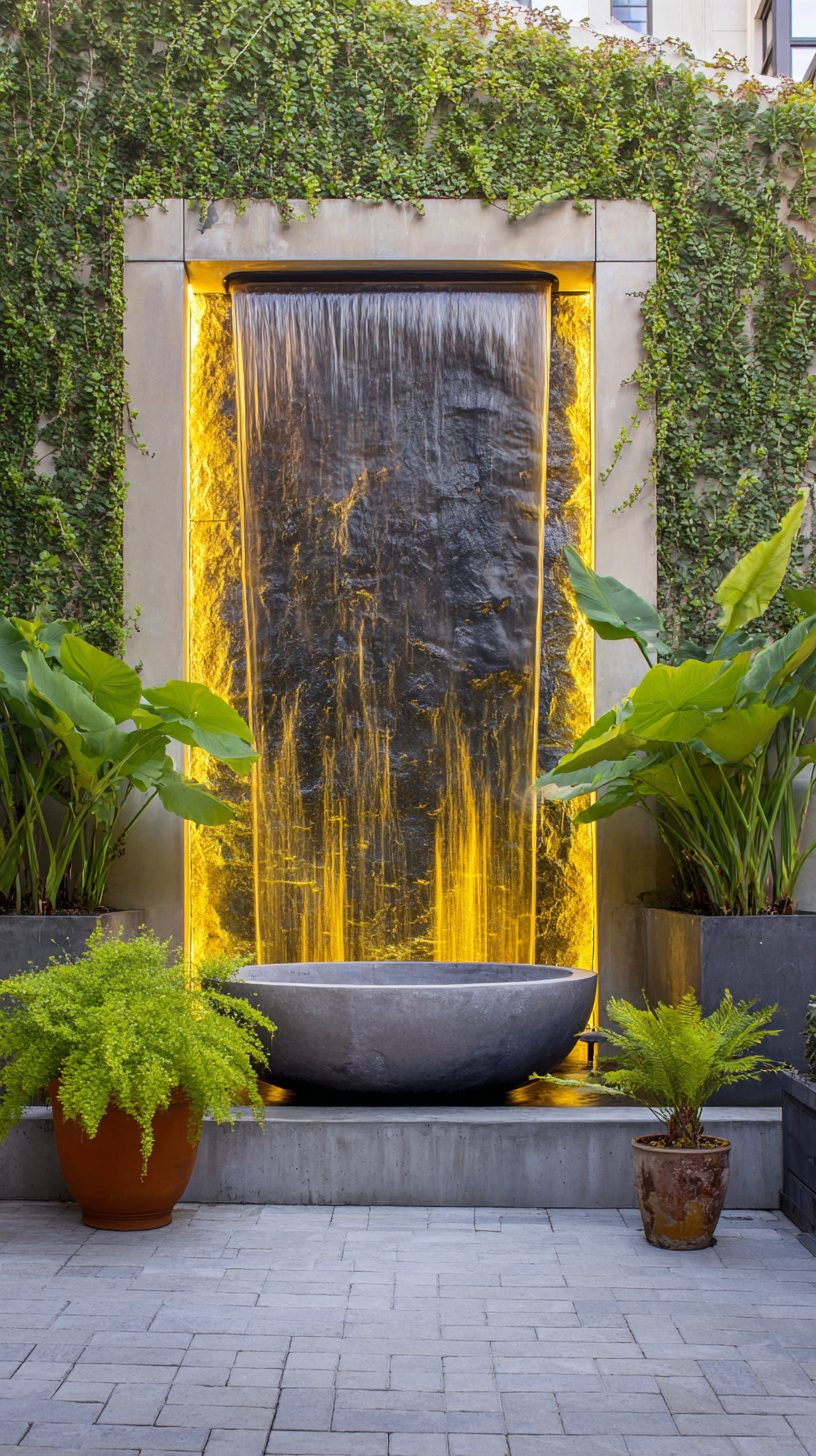 A glowing waterfall framed by cascading vines draws you into a serene courtyard space. Warm yellow lighting highlights the water as it flows over a textured black stone backdrop, creating a soothing focal point. The sound of water adds to the calming atmosphere, making it an ideal spot for relaxation.