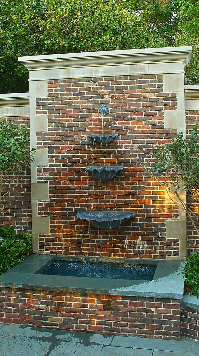 Water gently cascades down three ornate tiers set into a sturdy brick wall. The bricks have a warm, rustic feel, dotted with some lighter stone accents that frame the water feature. It creates a soothing ambiance, perfect for a relaxing backyard retreat.