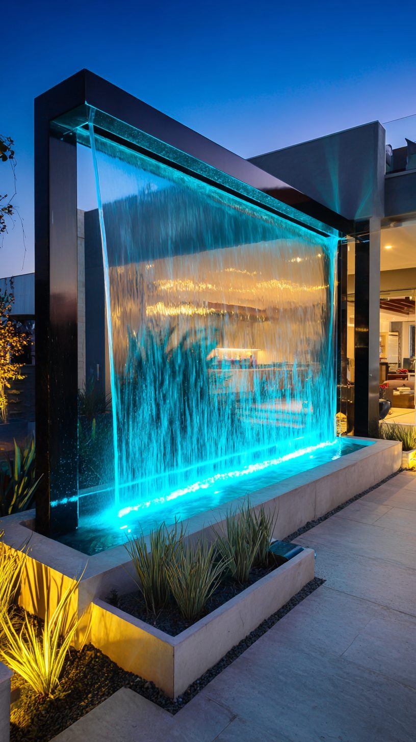 Check out this striking water feature – it’s not your everyday backyard setup. The water cascades down a sleek black frame, illuminated by a vibrant blue glow that pops against the dusk sky. It’s like having a bit of modern art that also happens to move and shine. The planting around it adds just the right amount of greenery without being overwhelming.