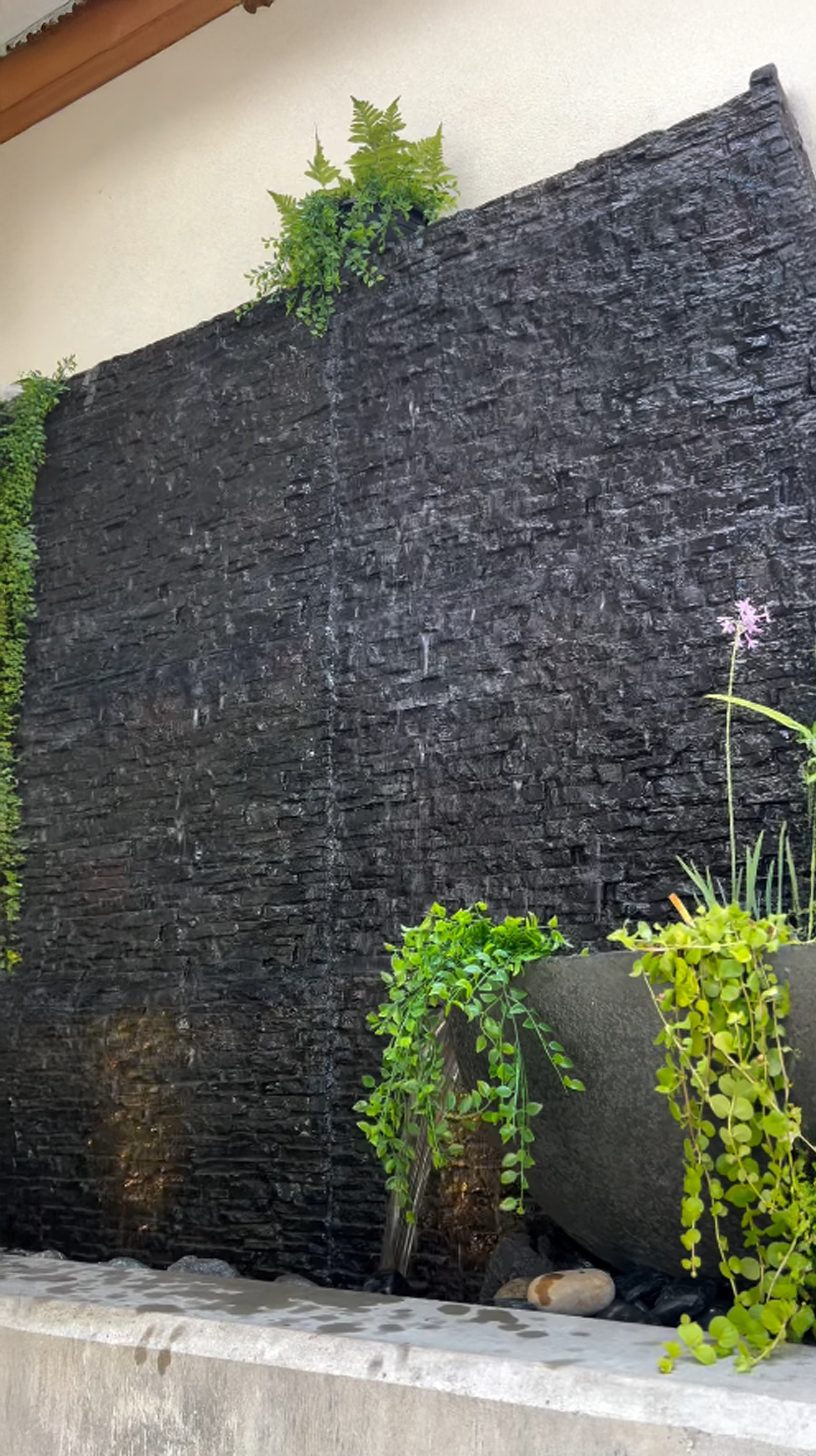 Water cascades gently down a textured black stone wall, giving a sense of calm and tranquility. On top, vibrant ferns poke out, their bright green contrasting beautifully with the dark stone. The constant trickle of water could easily drown out the world around you.