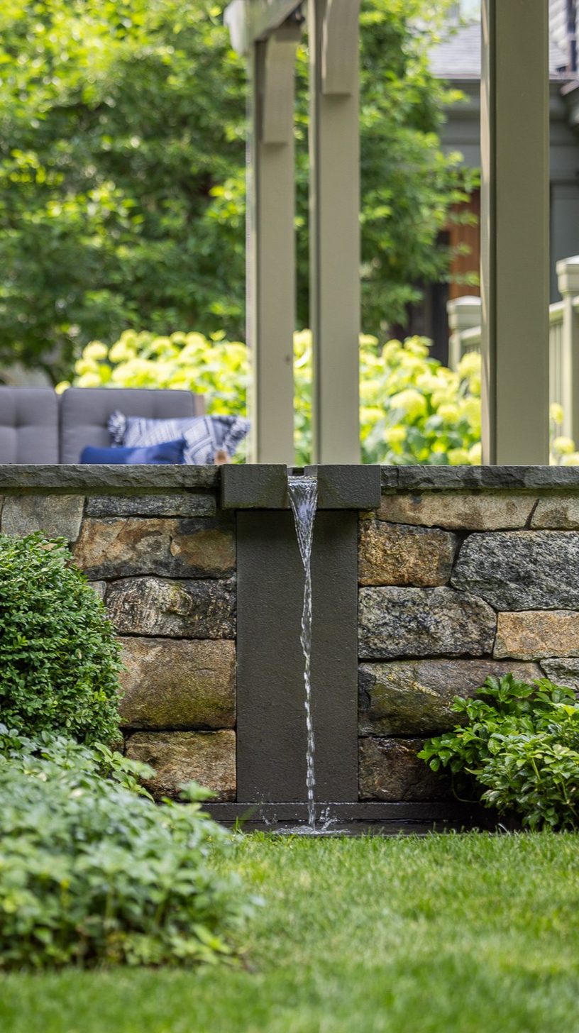 Water gently flows from a sleek, dark spout set into a rustic stone wall, creating a calming trickle. It’s a simple setup, but it adds a soothing touch to the vibrant green garden around it. The mix of natural stone and metal gives a balanced, modern feel.