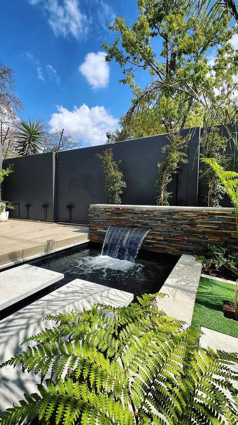 The beige facade gives a sharp contrast to the dark waterfall, highlighting the modern architectural style. Clean lines and geometric shapes dominate the space, adding an elegant touch. This design feels inviting and sophisticated without being flashy.