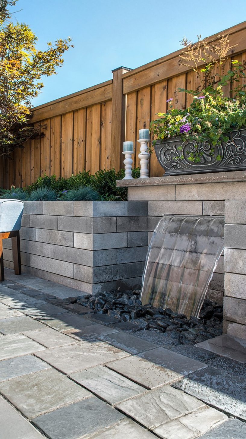 Pebbles lining the base add an earthy element, grounding the modern feel. The combination of stone textures and water creates a serene outdoor retreat. It’s an ideal spot for unwinding or impressing guests with its understated elegance.