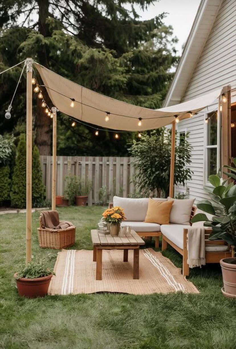 A large beige canopy stretches over this cozy backyard nook, giving it a relaxed, shaded vibe. String lights hang neatly along the canopy’s edges, adding a warm, inviting glow that hints at leisurely evenings outside.