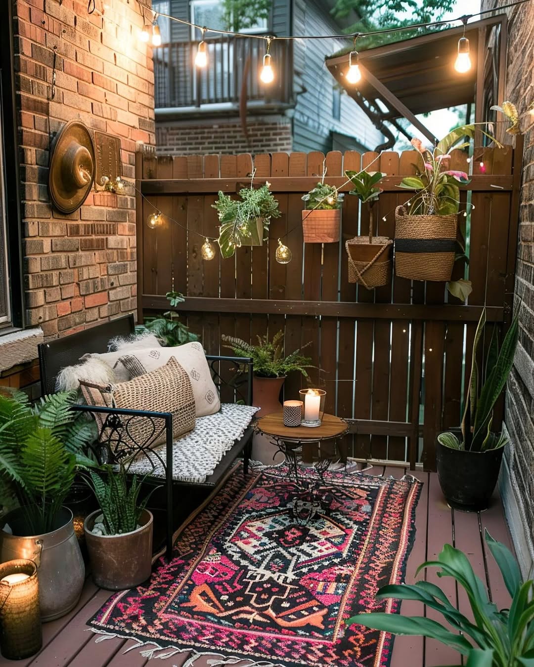 13. String Lights and a Colourful Rug Transform a Dull Balcony