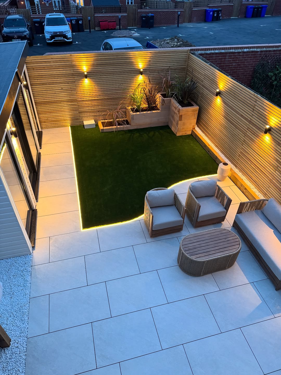 The glow from the wall lights casts a warm ambiance over the sleek patio. Large, light-colored tiles stretch across the space, creating a clean, modern feel. In the center, a patch of lush artificial grass is framed by subtle, ground-level lights, adding a touch of greenery without the upkeep.