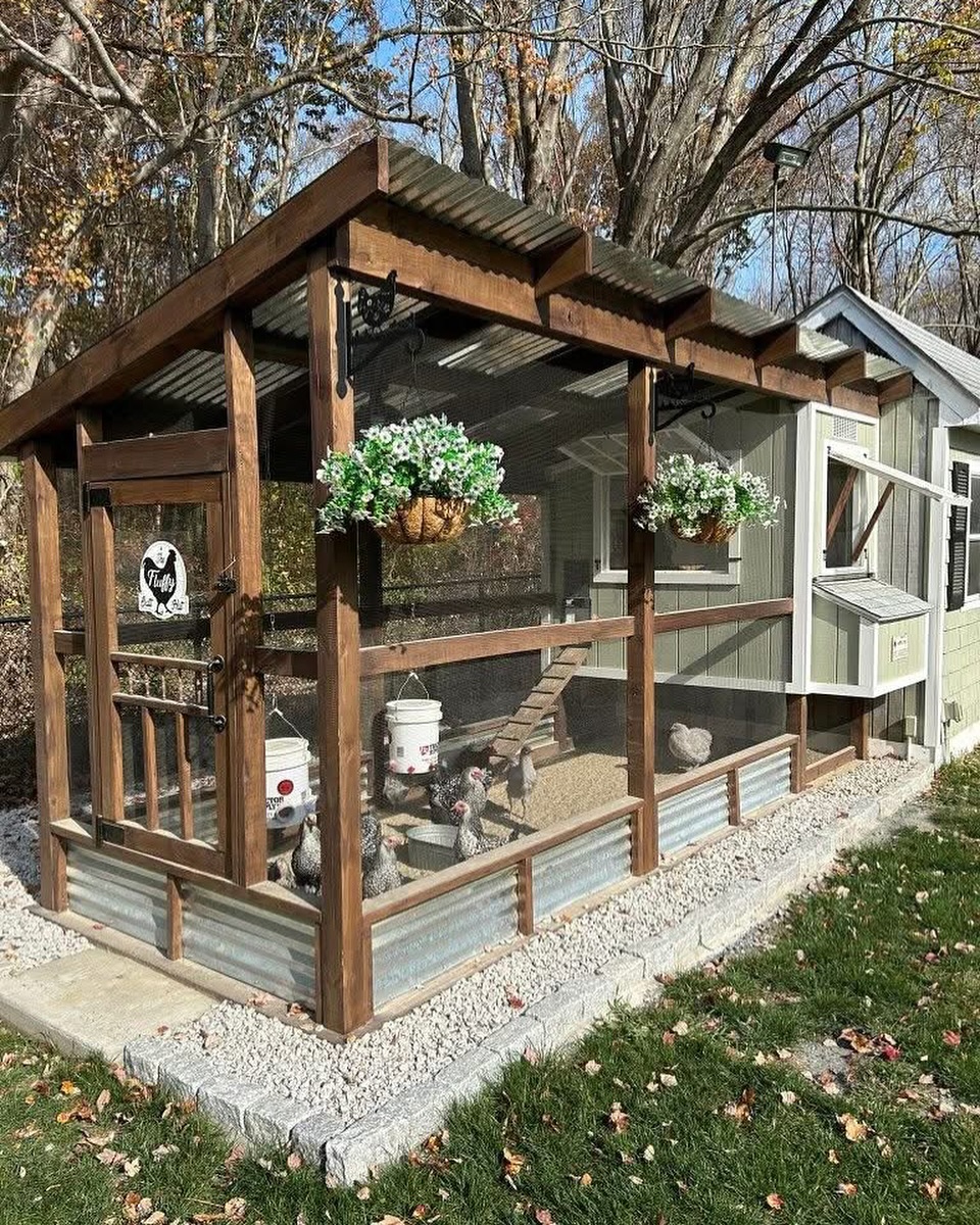 Bright green foliage spills from hanging baskets, adding a touch of nature to this well-structured chicken coop. The wooden frame is solid, giving the space a rustic yet functional charm. Below, there’s a layer of corrugated metal that makes the base sturdy and long-lasting.