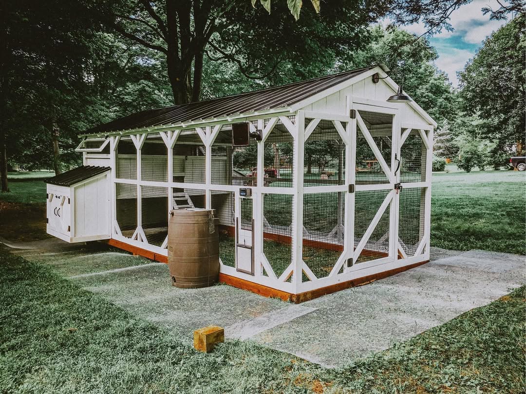 Bright white walls make this chicken coop stand out against the backdrop of trees. The clean, corrugated metal roof adds a touch of durability. A couple of vintage-style green lamps hang above, blending rustic charm with practical lighting.