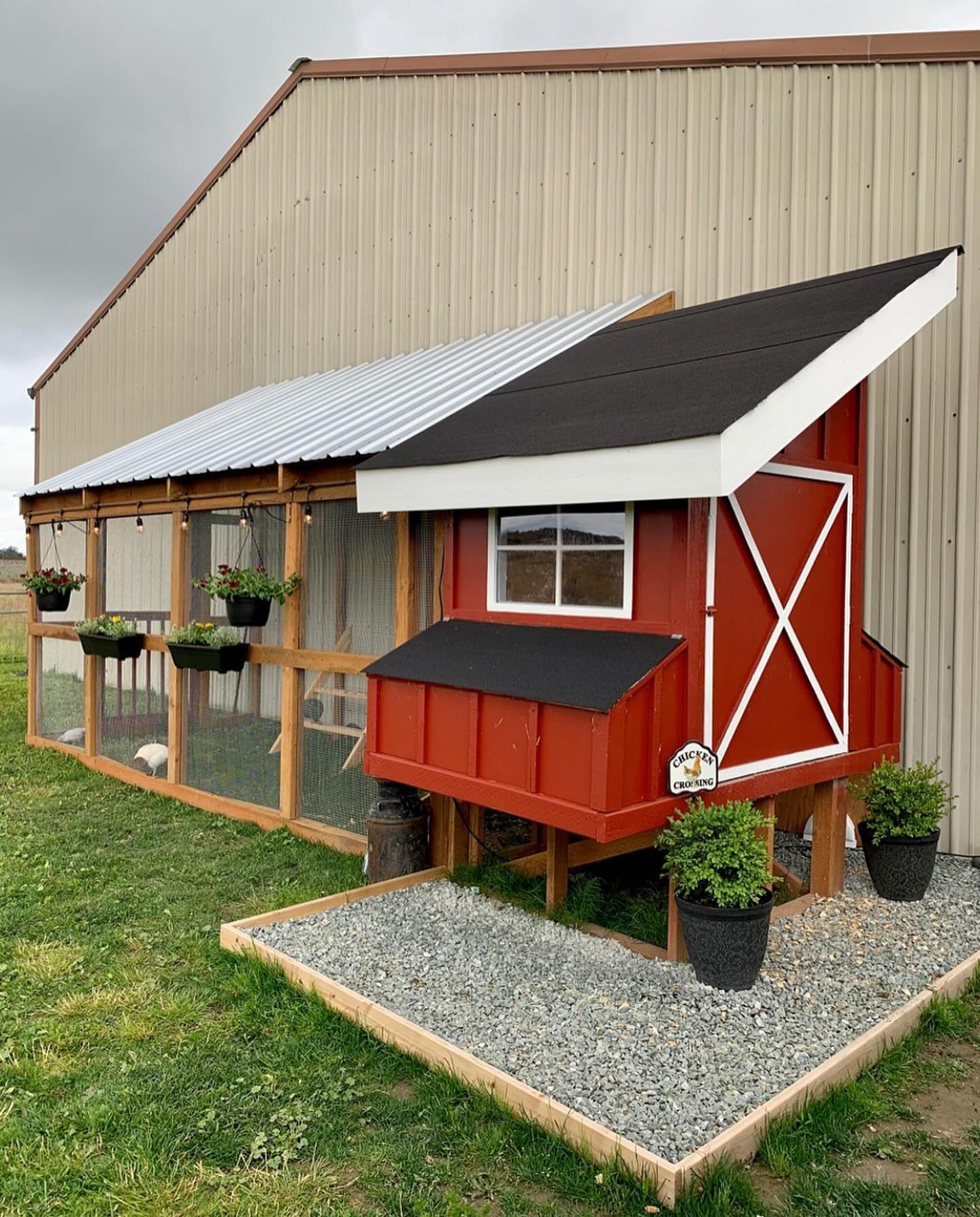 Bright red and white colors pop out against the muted surroundings of the henhouse. The coop’s barn-style shape adds a rustic charm, making it feel like a mini farmhouse. It’s perched neatly on gravel, framed by two planters with lush greenery, bringing some life to the scene.