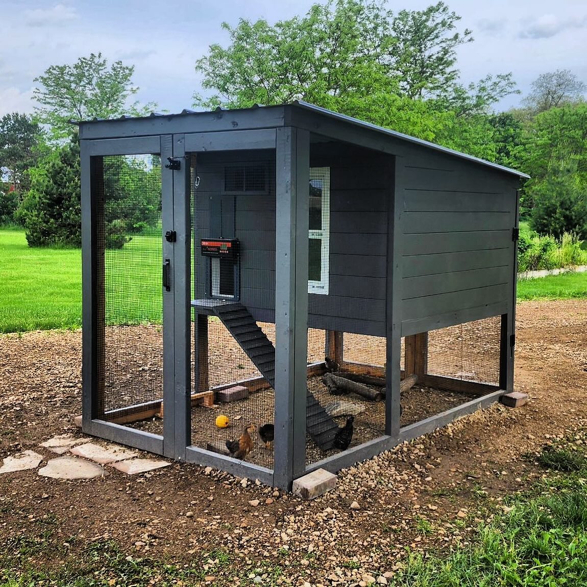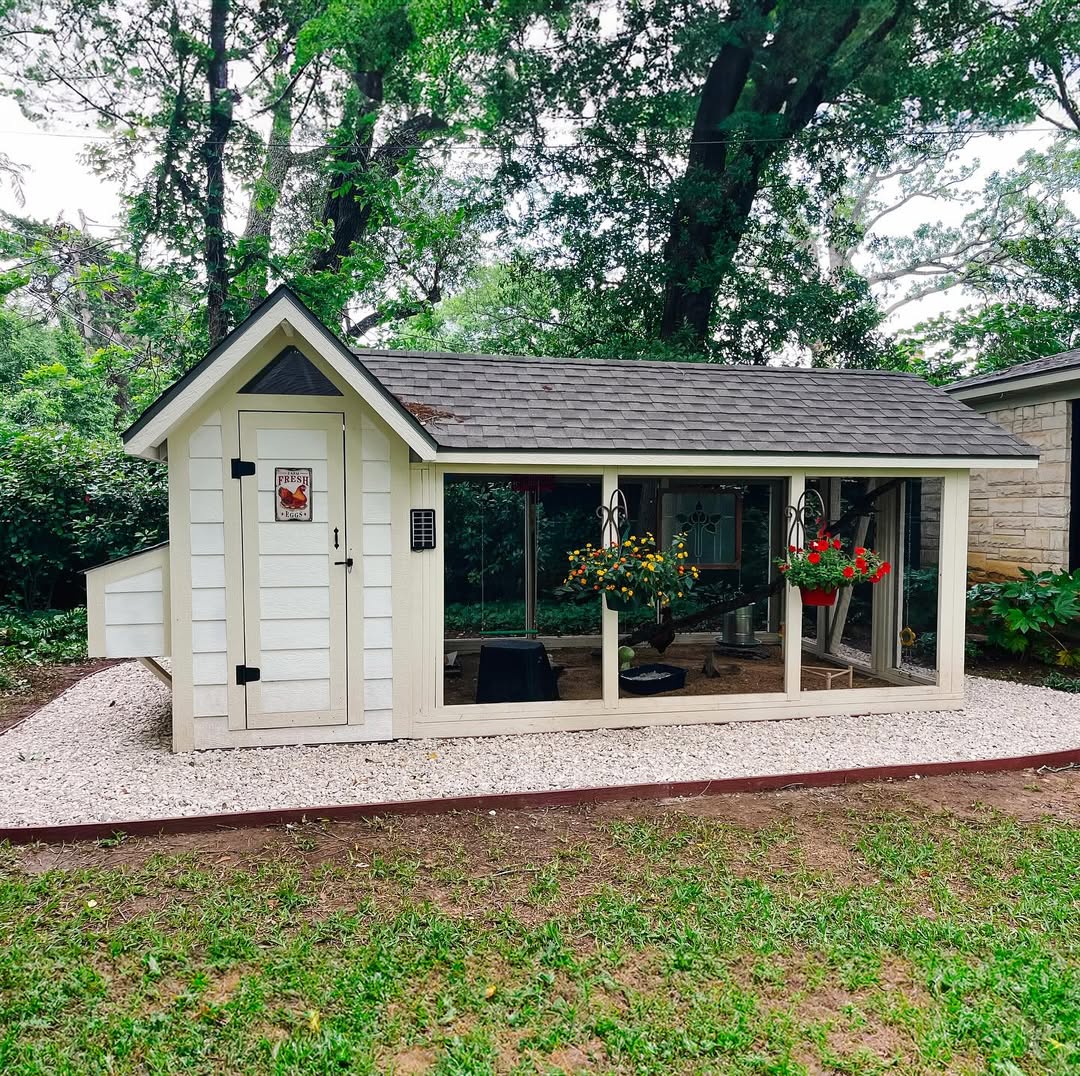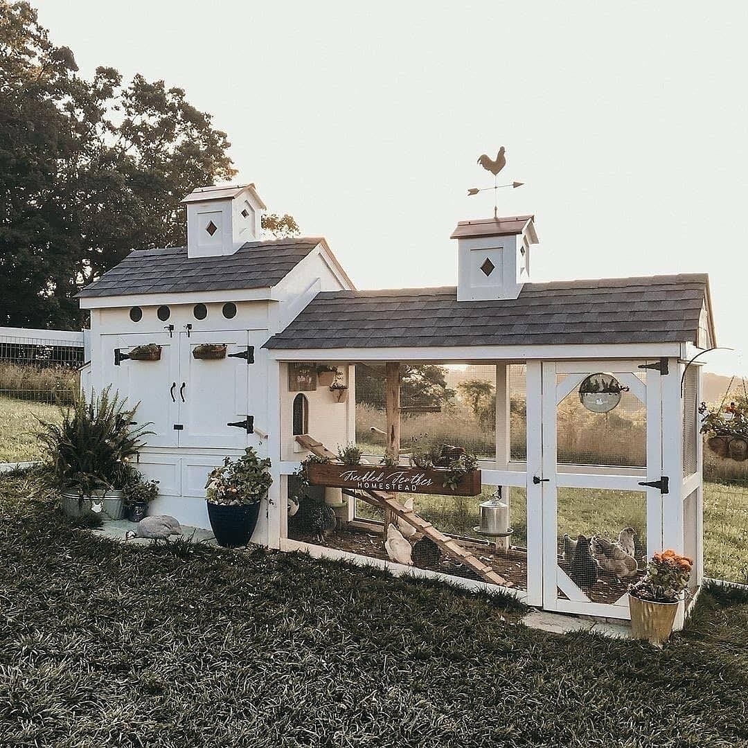 With its crisp white paint and charming design, this chicken coop feels like a countryside retreat for hens. Two little cupolas sit atop the shingled roof, giving off a rustic yet polished vibe. The small weather vane adds a quaint touch that makes it look more like a tiny house than a traditional coop.