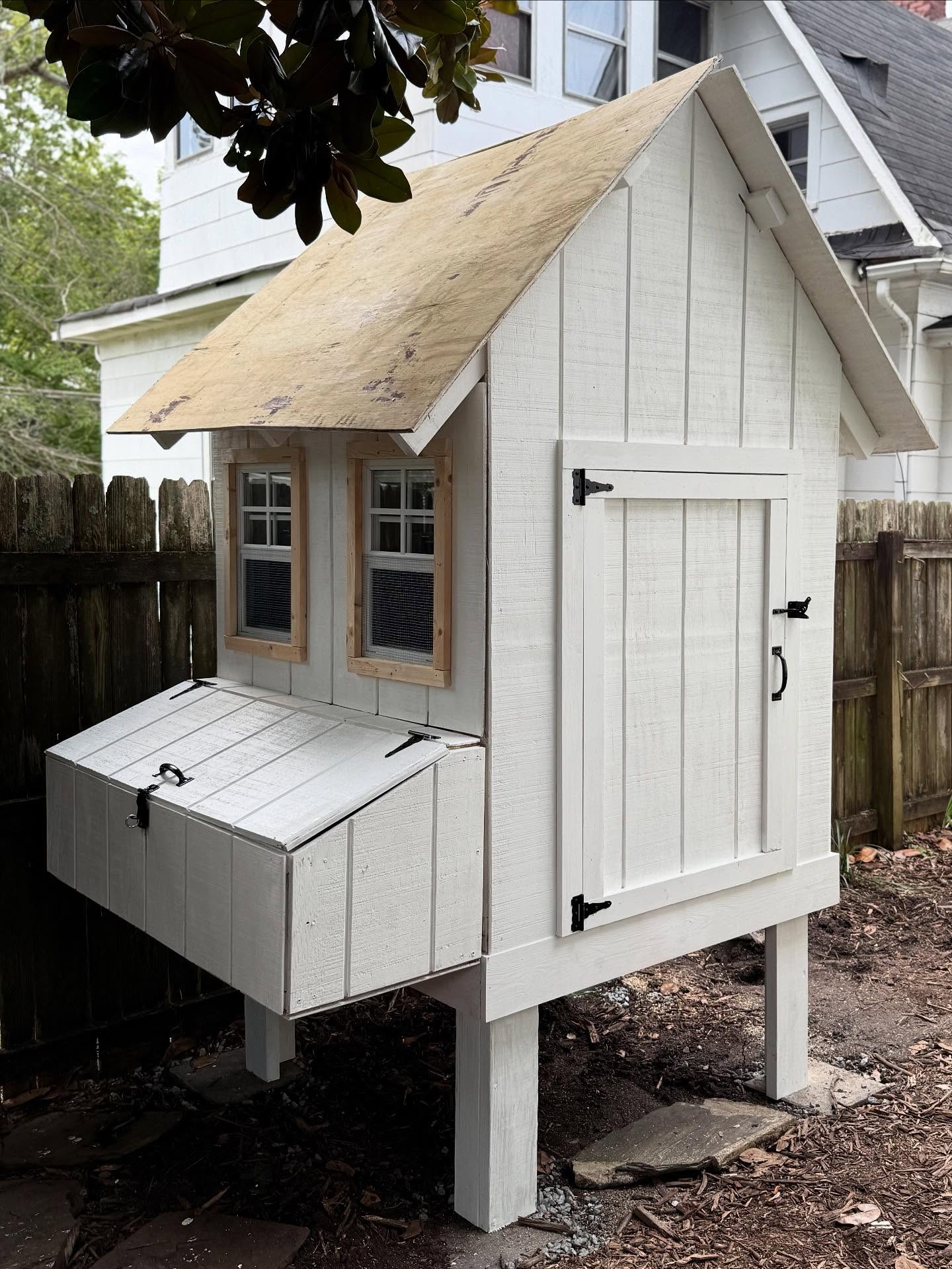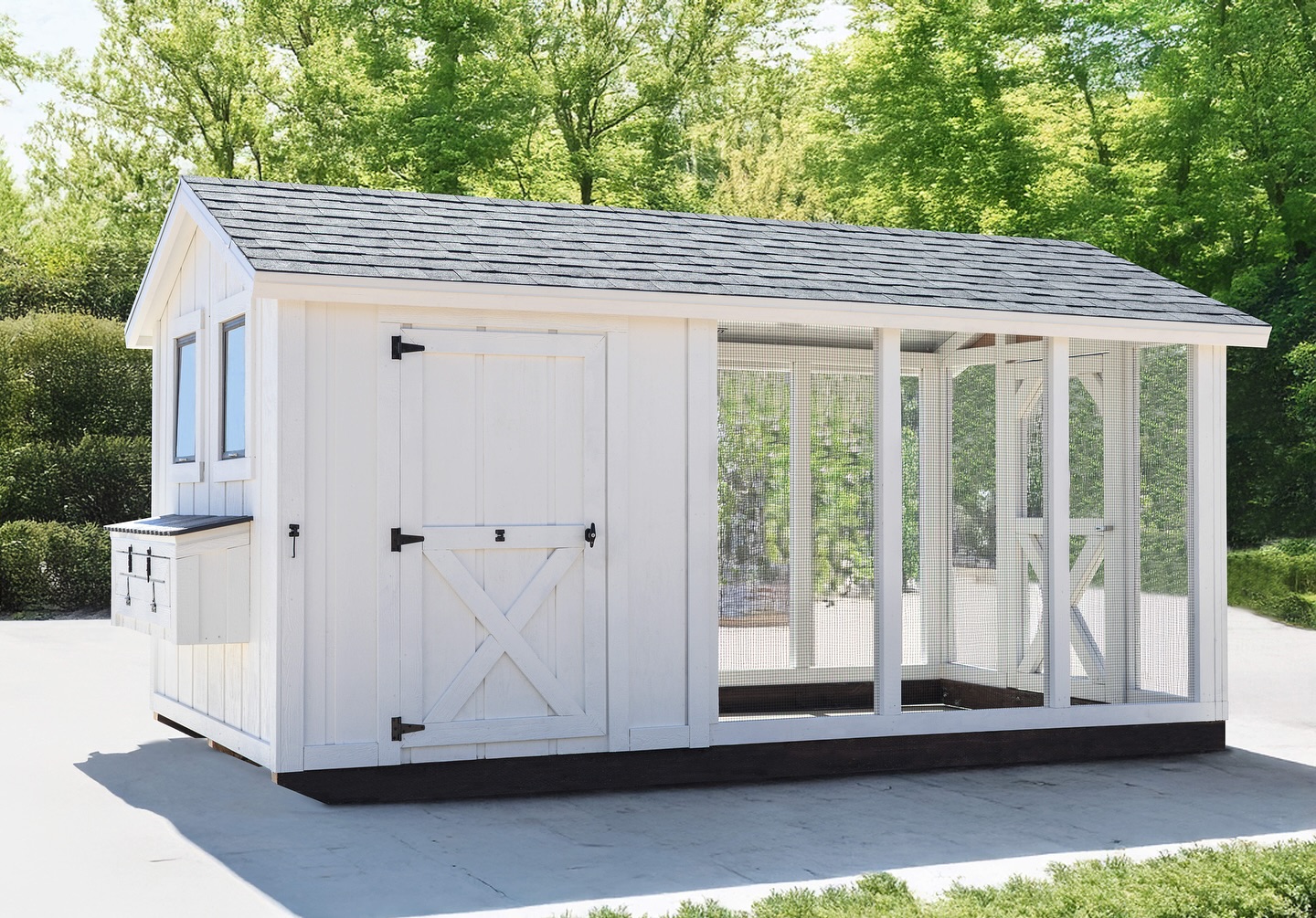 Crisp white siding and a neat asphalt roof stand out against the lush green backdrop. The chicken coop’s clean lines and practical design make it an eye-catching feature of any backyard.