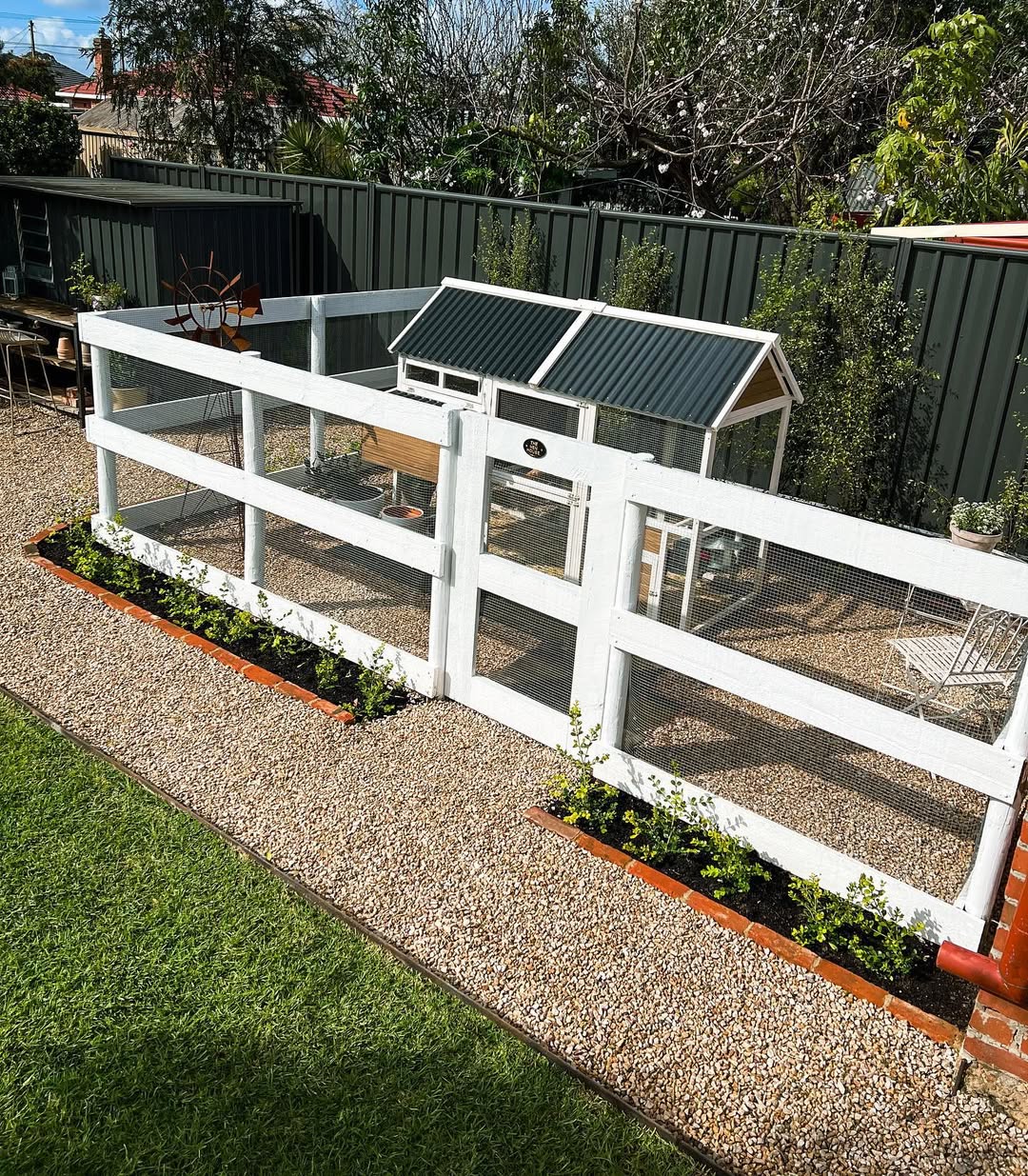A sleek, white-painted fence surrounds a cozy chicken coop, giving it a tidy and fresh look. The fence is made of solid wood with mesh panels, keeping everything secure and open. Inside, the coop has a stylish green roof, making it blend nicely with the garden setting.
