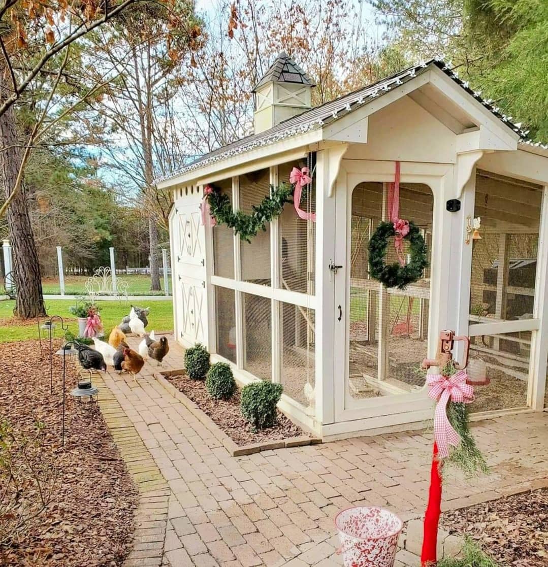 Bright red ribbons and festive wreaths add a touch of holiday spirit to this charming chicken coop. The crisp white paint and decorative details give it a cozy, farmhouse vibe. It sits along a neat brick pathway, which is lined with small, trimmed shrubs for a tidy look.