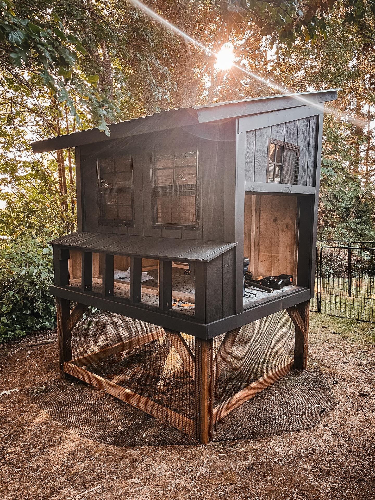 Sunlight beams through the trees, casting a warm glow on a modern black chicken coop. The structure stands elevated, supported by strong wooden beams, giving it a sturdy look. It feels nestled in nature, surrounded by greenery, making it an appealing spot for some lucky chickens.